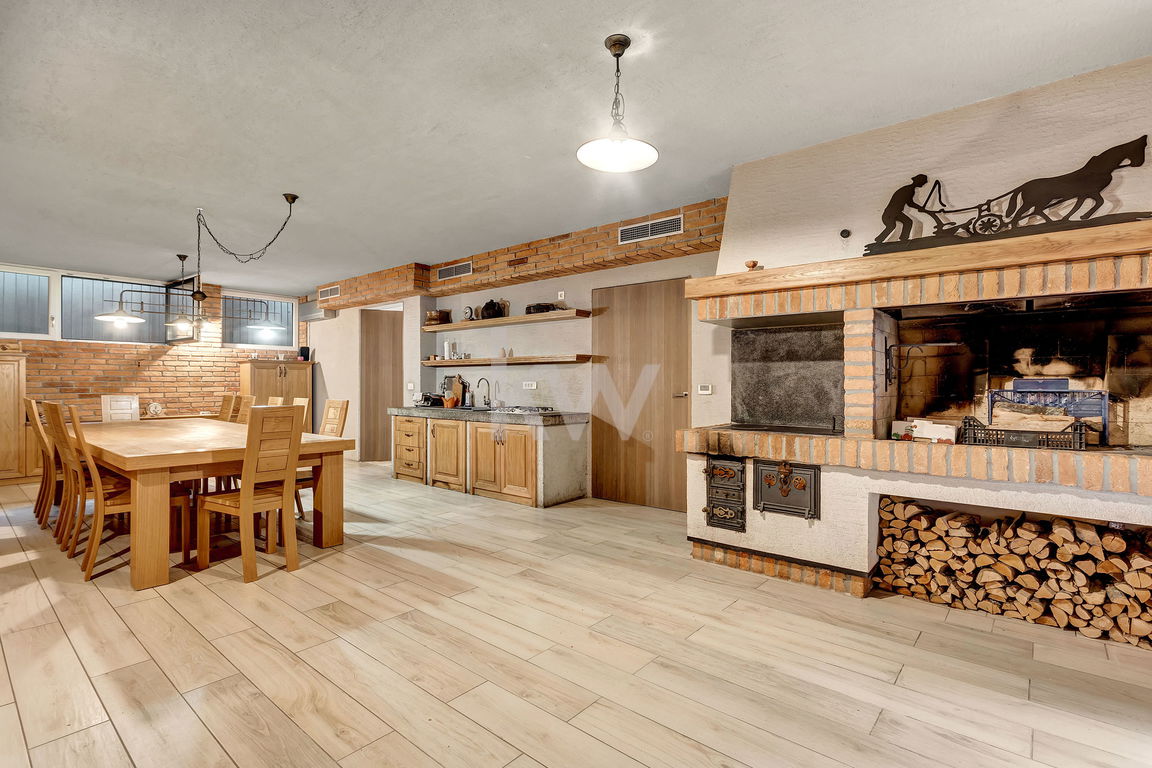 V kleti se nahaja velika kmečka soba z velikim kaminom, primerna za druženje, vinska klet, soba za goste s kopalnico, kurilnica, shramba, utility in izhod na dvorišče.