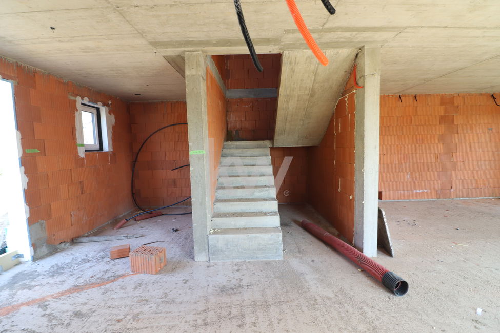 Nadstropje zajema: stopnišče 6,23m2, hodnik 5,34m2, kopalnica 7,90m2, spalnica 13,99m2, garderoba 7,13m2, utility 5,17m2, otroška soba ena 15,23m2, otroška soba dva 15,31m2 terasa v velikosti 10,08m2, SKUPAJ POVRŠINE: 153,17m2. TRATE OZIROMA ZELENICE JE V VELIKOSTI 80m2.