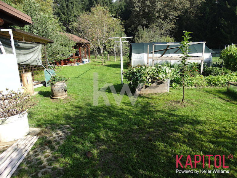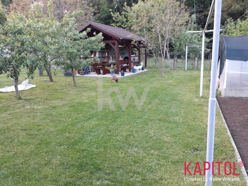 Prostorna zelenica je urejena in vam ponuja brezskrbno uživanje na svežem zraku z možnostjo vrtičkanja (ograjen z betonskimi robniki tlorisne površine 70m2 in postavljenim pokritim rastlinjakom). Na travniku je zasajeno raznovrstno sadno drevje (jabolka, hruške, češnje, breskve, kaki, kivi, robide ter maline). Na severni strani parcele je gozd.