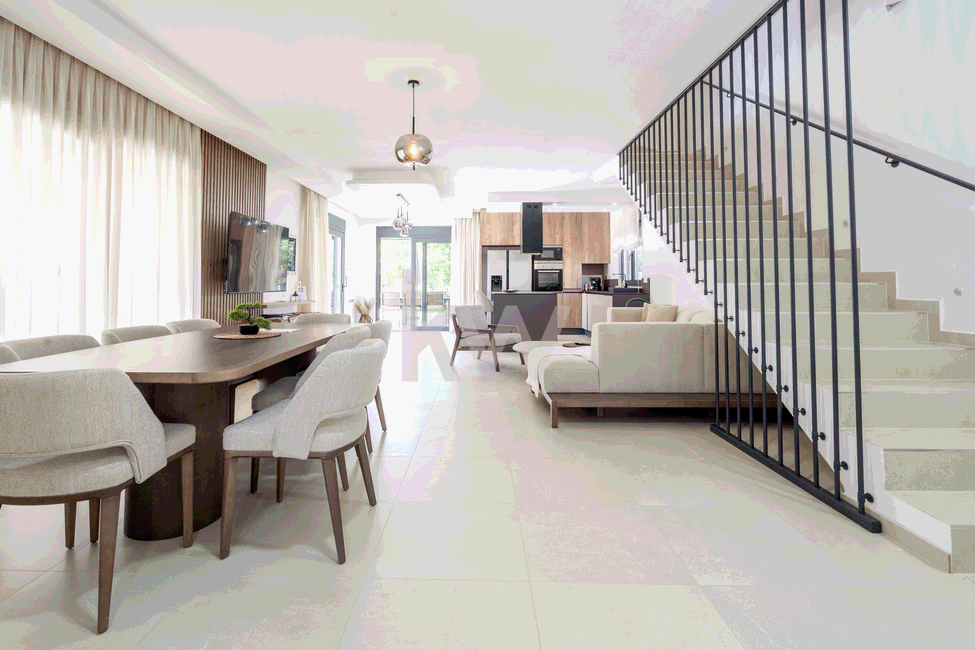 Razporeditev prostorov v pritličju: predprostor, kurilnica, wc za goste, spalnica z lastno kopalnico in z urejenim izhodom na teraso ter dnevni prostor z jedilnico in kuhinjo iz katerega je urejen izhod na teraso z letno kuhinjo in bazenom. Notranje stopnice vodijo v prvo nadstropje.