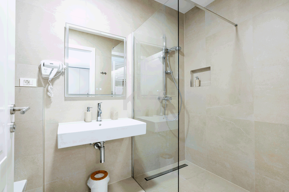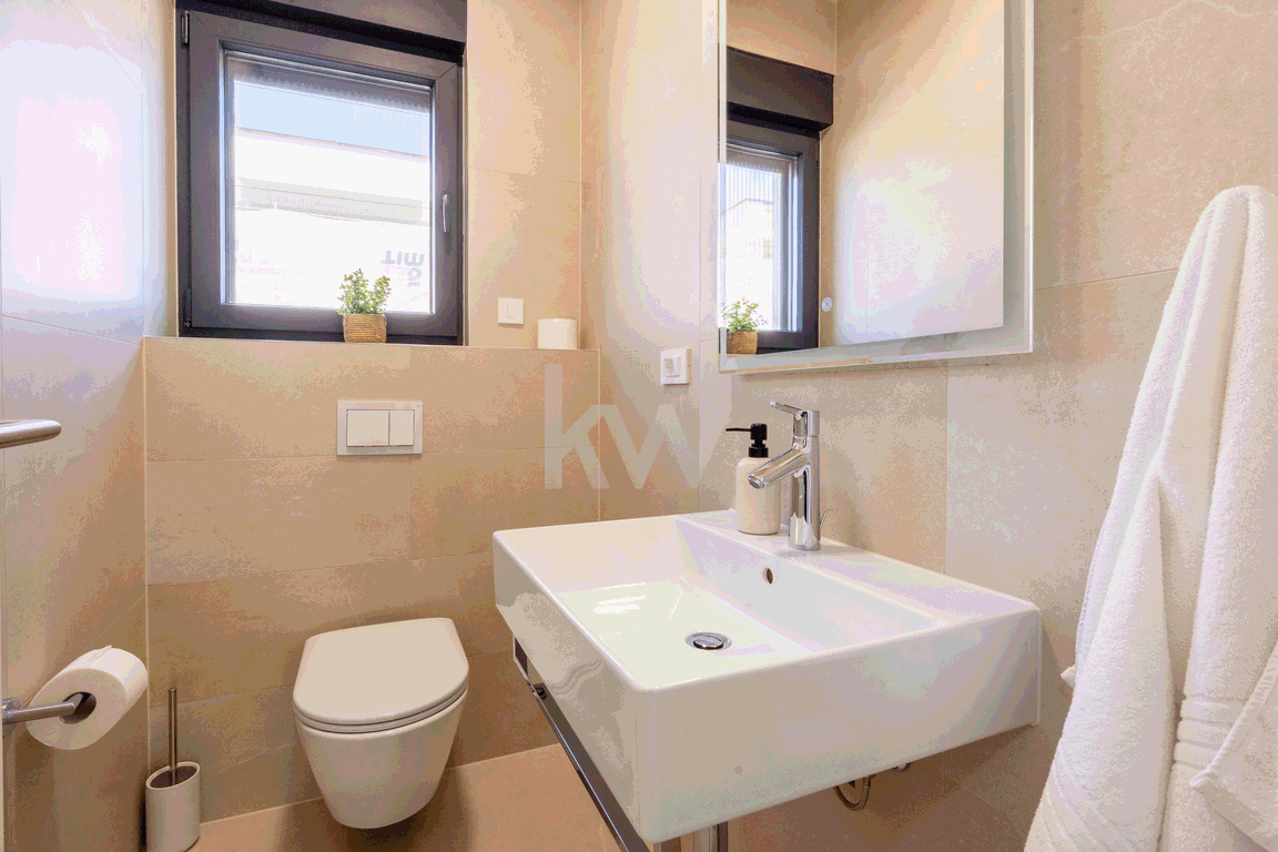 Razporeditev prostorov v nadstropju: hodnik, 3 spalnice z lastnimi kopalnicami od tega je iz glavne spalnice (master bedroom) urejen izhod na teraso.