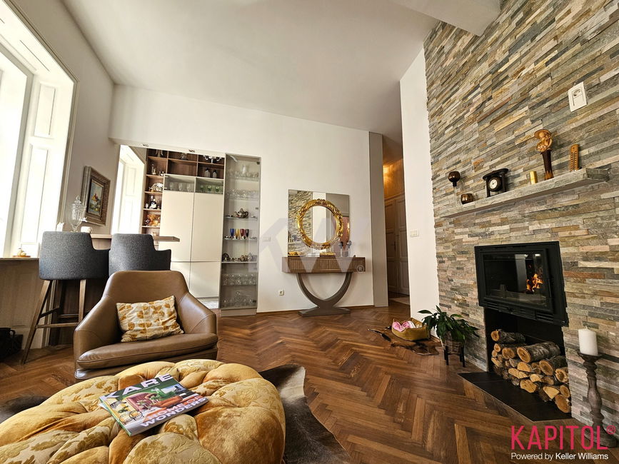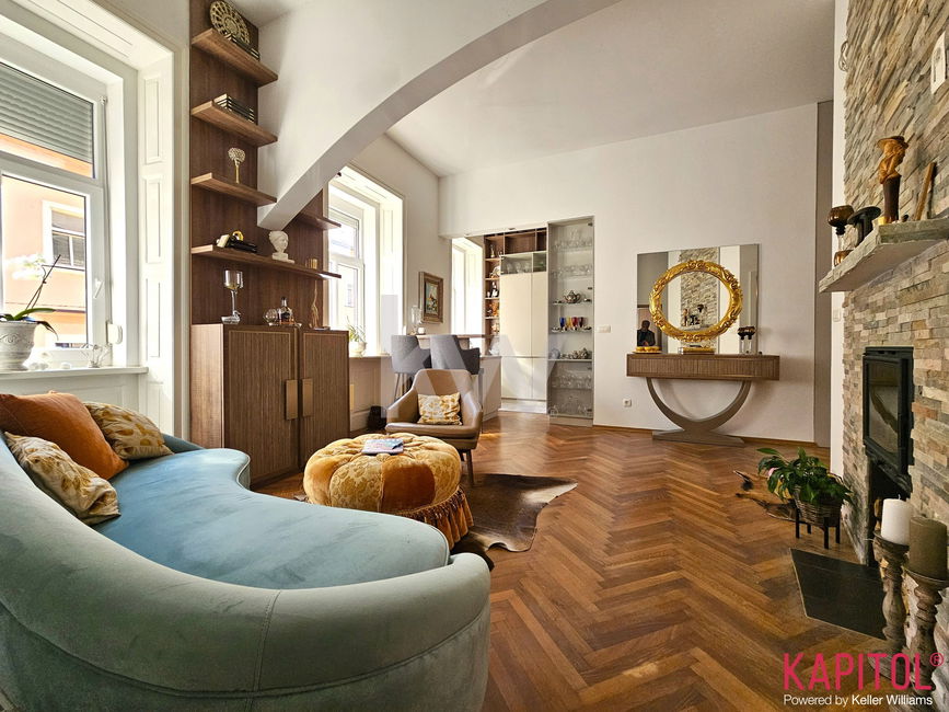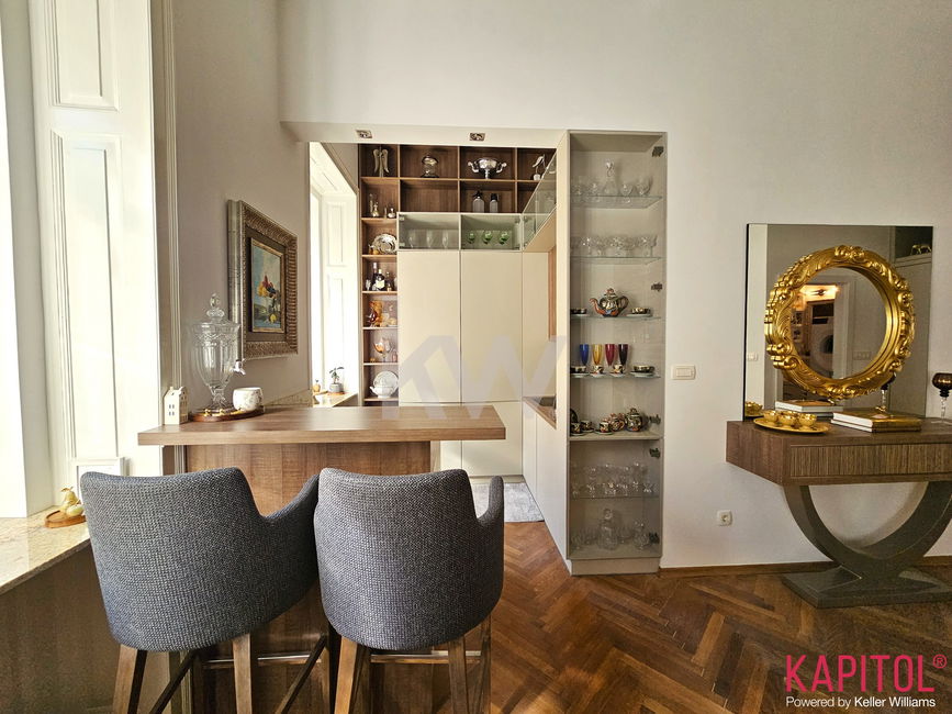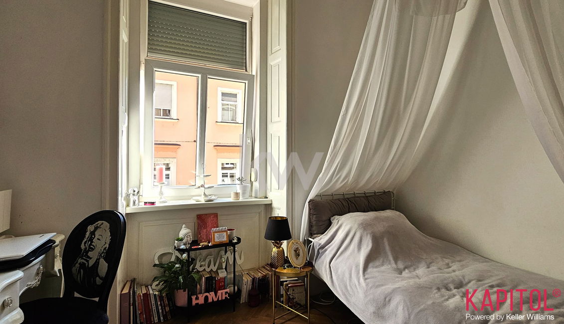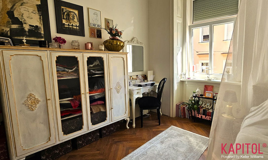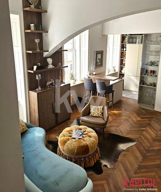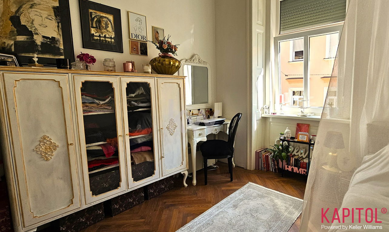 Stanovanje odlikuje ugodna lega – sončna svetloba bogato obsije prostorne sobane, široka okna odpirajo razgled na mestni vrvež, visoki stropi pa vdihujejo bivališču občutek prostornosti in ugodja.