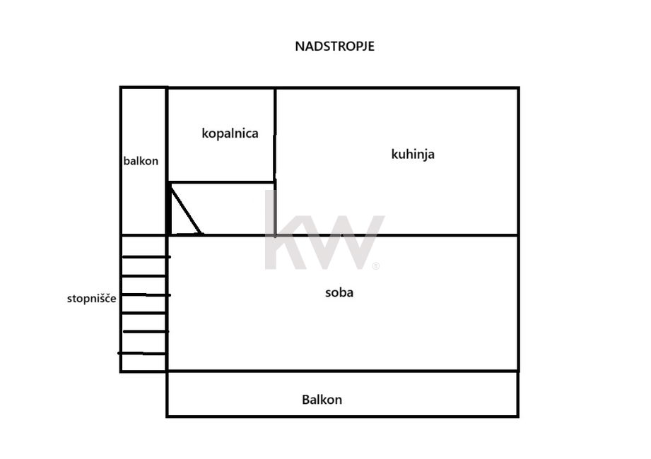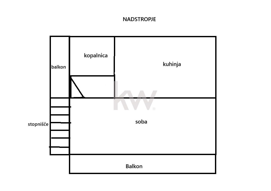 Nadstropje: nedokončana kopalnica, kuhinja in dnevni prostor z izhodom na balkon.