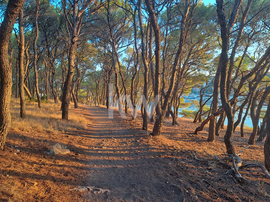 Kristalno čisto morje, sence borovcev in sprehajalne poti.