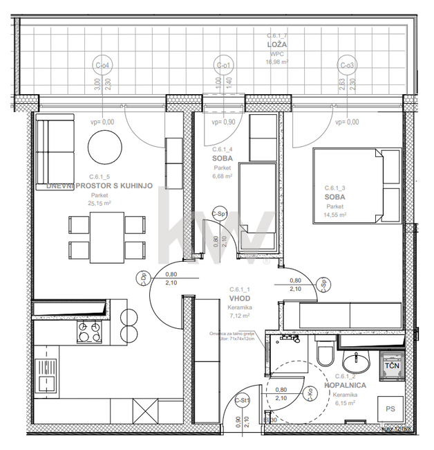 Stanovanje zajema: vhod 7,12 m2, dnevni prostor s kuhinjo in jedilnico 25,15 m2 z izhodom na ložo, spalnica 14,55 m2, otroška soba 6,68 m2, kopalnica 6,15 m2, skupaj bivalno: 59,65 m2, ostalo: loža 16.98 m2, shramba v kletnem prostoru 3,14 m2, lastniško parkirno mesto v garaži.