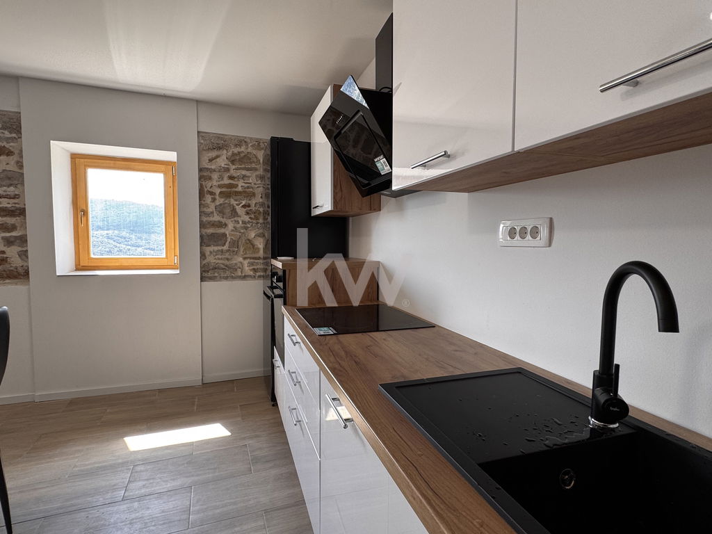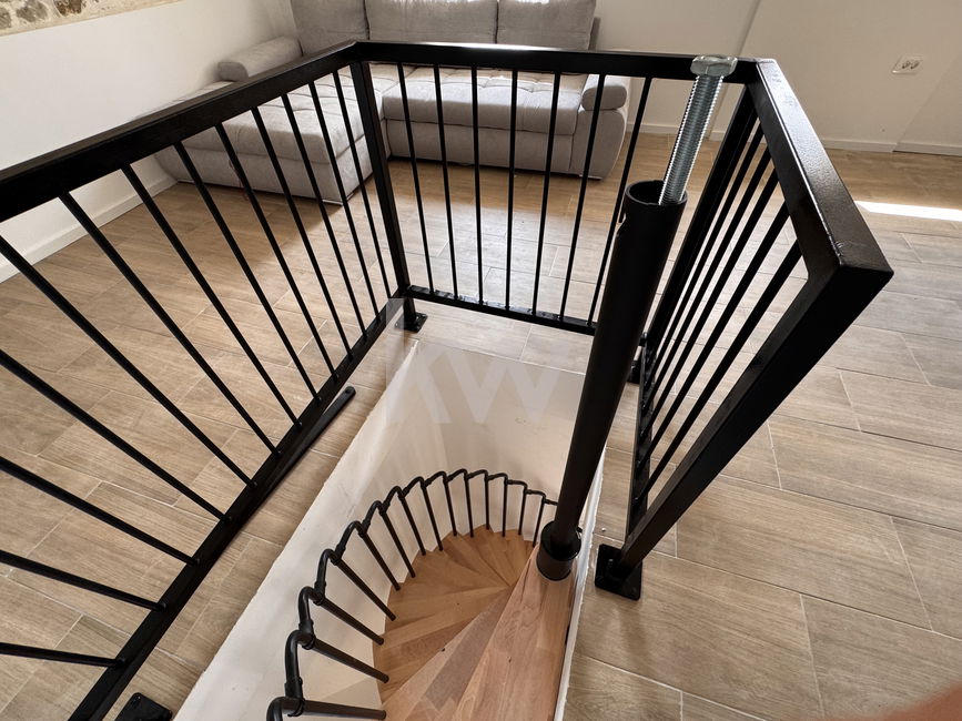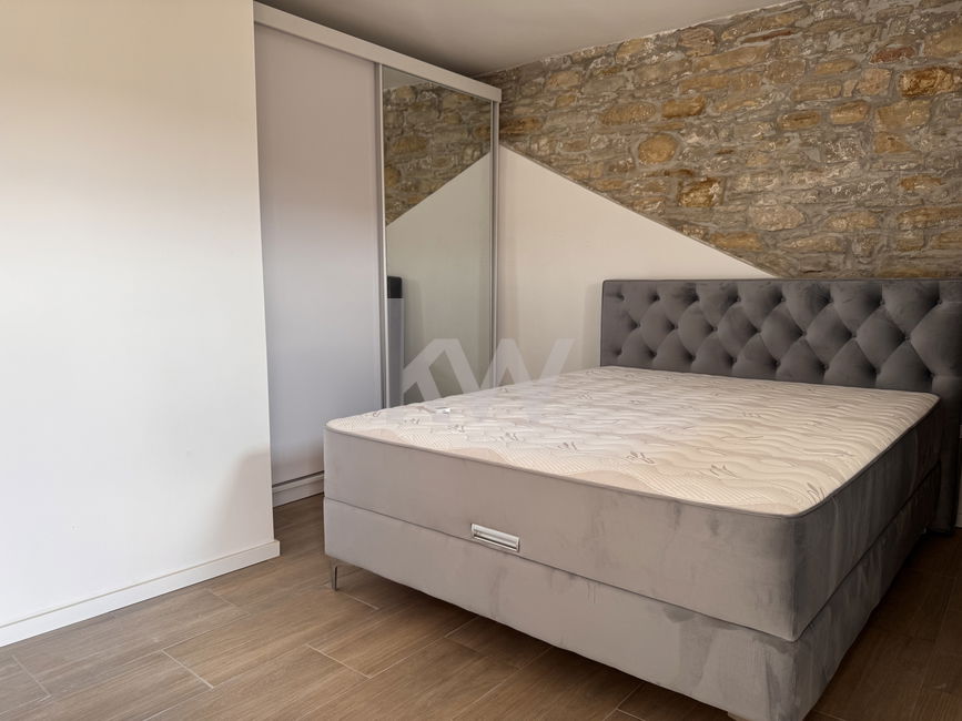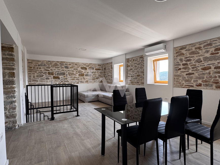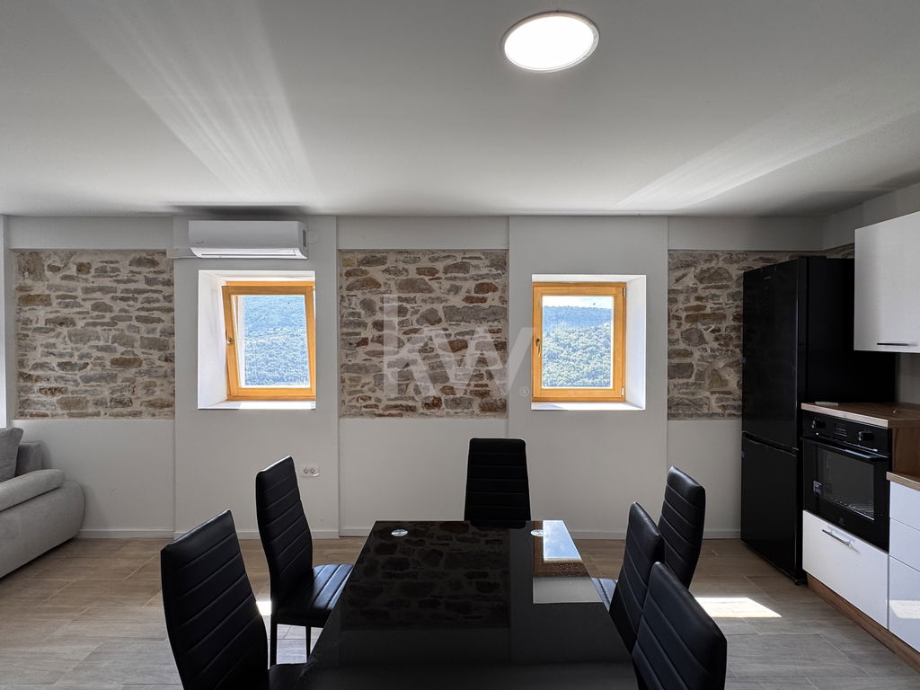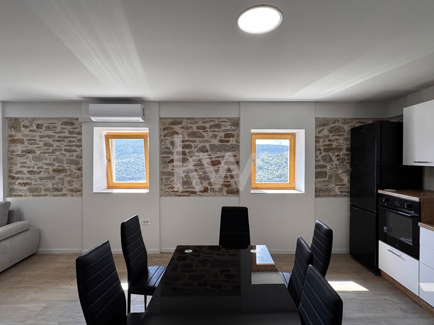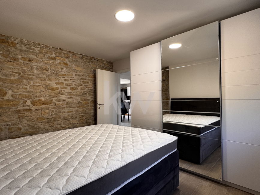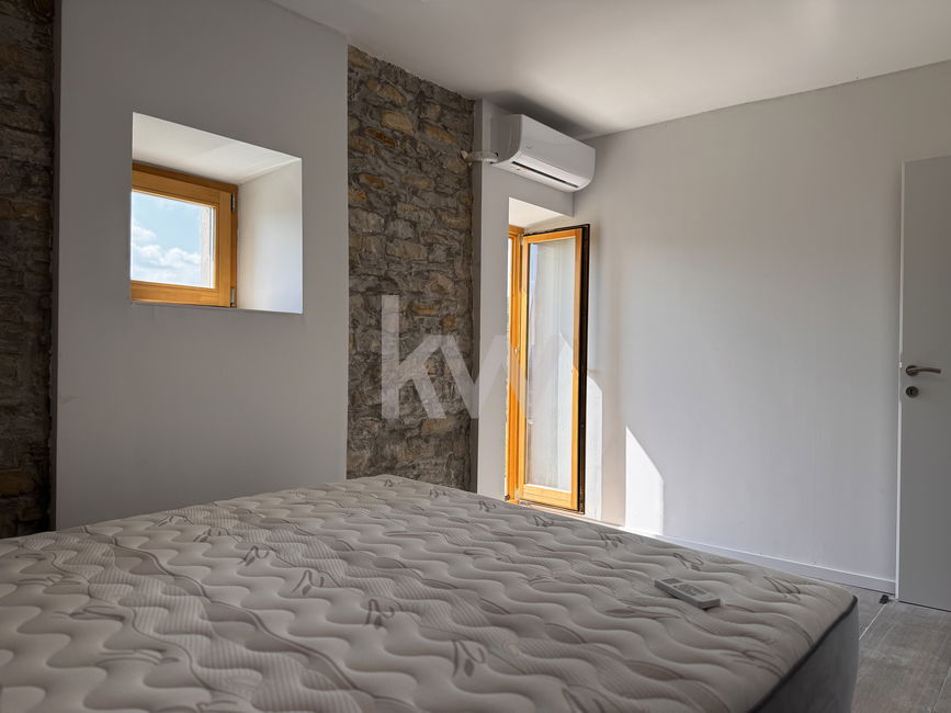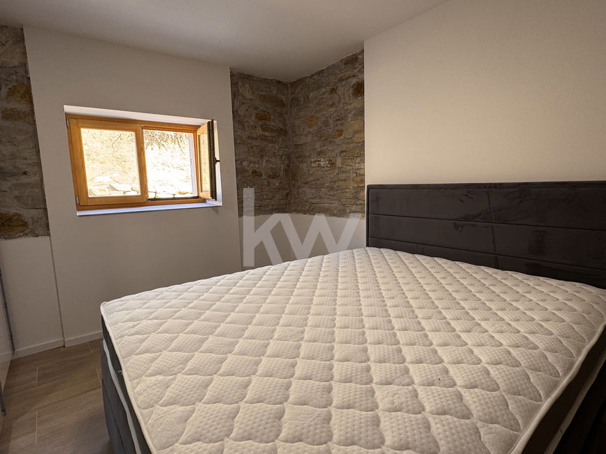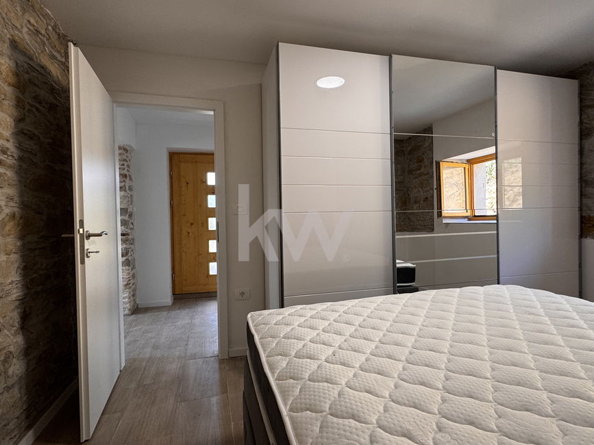 Popolnoma obnovljena notranjost z ohranjenimi kamnitimi detajli.