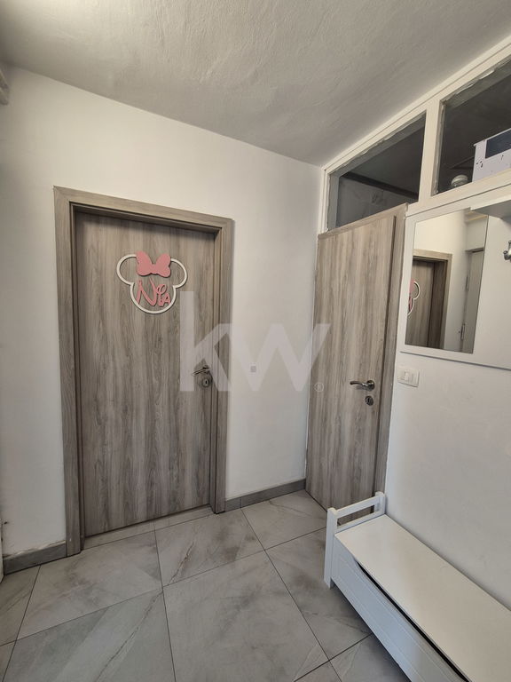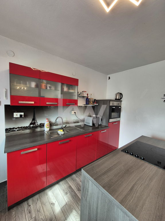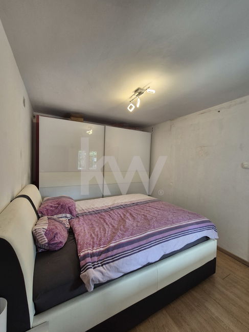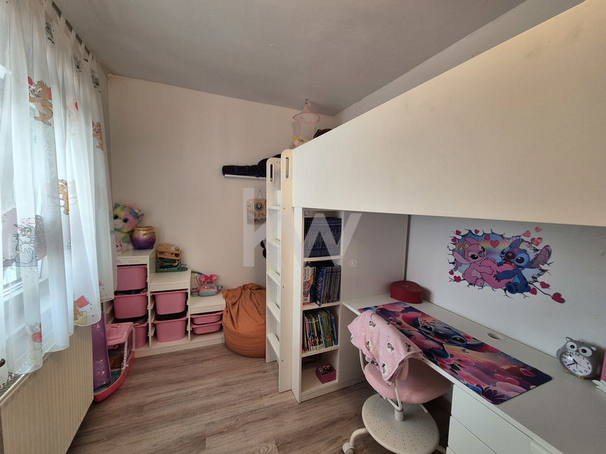 Razporeditev prostorov: predprostor, kopalnica, spalnica, otroška soba, kuhinja z jedilnim kotom, dnevni prostor ter shramba.
