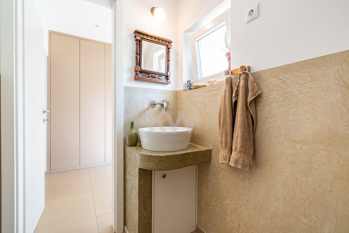 Opis: Hiša je razporejena na dveh etažah, s funkcionalnim tlorisom in obilico naravne svetlobe. V pritličju se nahajajo dnevni prostori: prostorna kuhinja z jedilnico in dnevno sobo ter izhodom na teraso, kopalnica, ločen wc in shramba. V nadstropju so spalni prostori (2 spalnici) ter dodatna kopalnica.