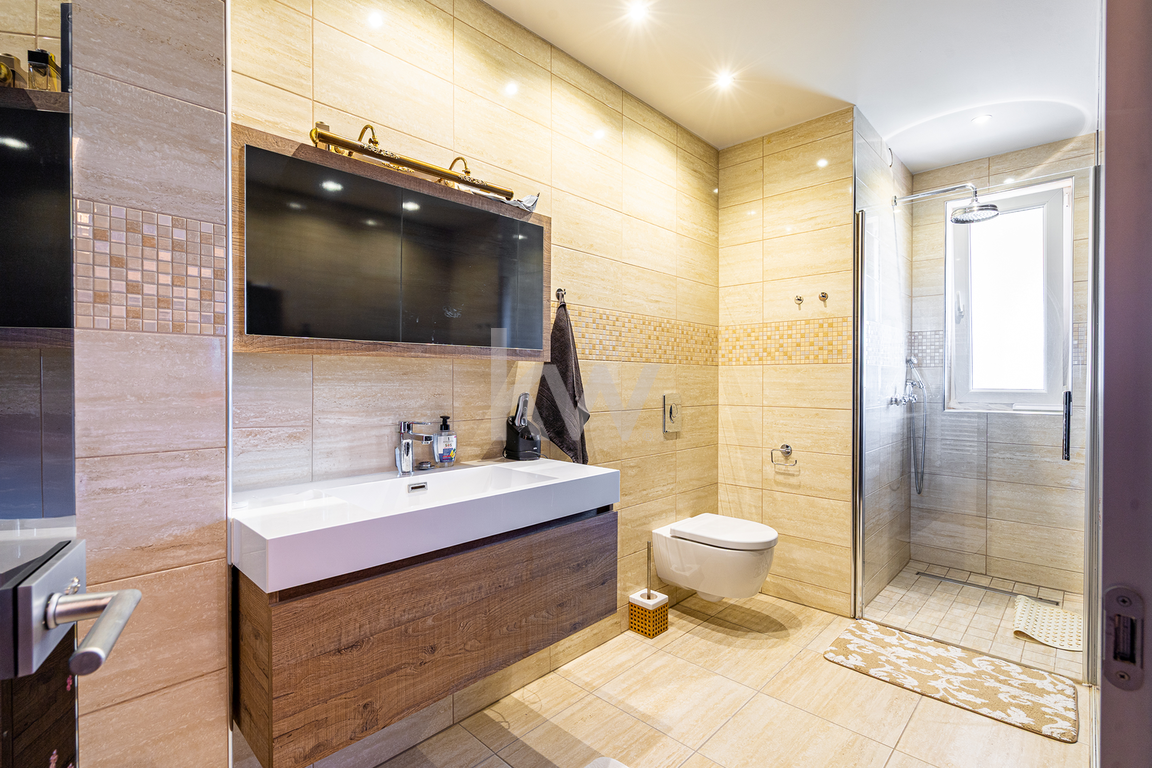 Predstavljamo individualni stanovanjski objekt, ki ima tri ločene bivalne dele in je kakovostno grajen ter ima veliko nadstandardnih detajlov. Velikost zemljišča je 1443 m2 in neto tlorisna površina dela stavbe je 424,4 m2 (bivalni prostor 346,90 m2, shrambe 34,10 m2 in balkoni 43,40 m2). Konfiguracija terena je v naklonu iz višje severne strani proti nižjim južnim stranem. Pred hišo se nahaja nadkrita letna kuhinja in vrt s parkirišči. Za hišo pa se razprostira veliko urejeno dvorišče z dvema enostavnima lesenima objektoma, kjer je bil predviden tudi bazen. Ker so za hišo izvedene terase, so sezidani kamniti podporni zidovi. Celotna nepremičnina je ograjena in pod videonadzorom ter varovana z alarmnim sistemom. Hlajenje je urejeno s klimatskimi napravami (8x) in gretje je urejeno s toplotno črpalko (talno gretje). Nepremičnina ima tudi gradbeno dovoljenje in vso infrastrukturo individualne rabe (telefonijo, vodovod, elektro..). Nadstropja so med seboj povezana z internimi stopnicam in z dvigalom (ki vodi v vse etaže). Dostop do nepremičnine je urejen neposredno iz javne ceste. Nepremičnina nudi neomejene možnosti, bodisi kot družinska hiša ali kot priložnost za investicijo, zato ima velik potencial.