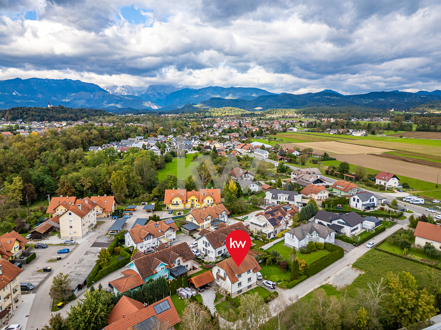 Zunaj so še dodatni prostori, kot so nadstrešek za parkiranje dveh vozil, objekt za shranjevanje ter dvojen dovoz.