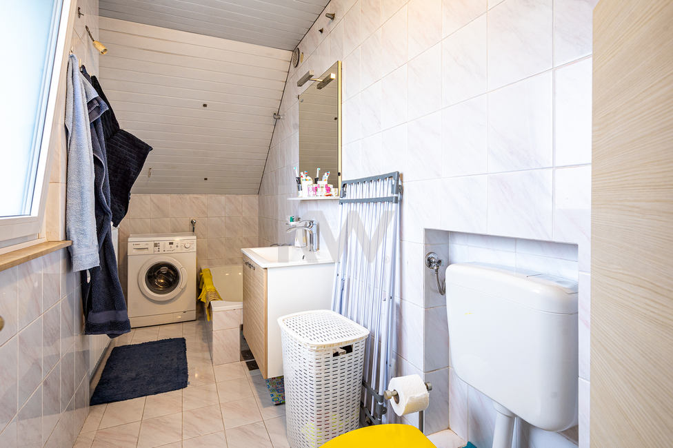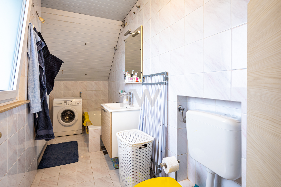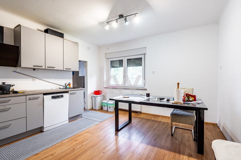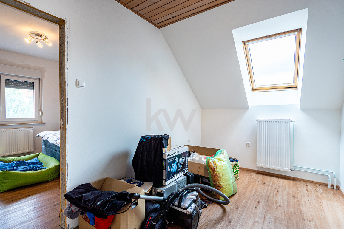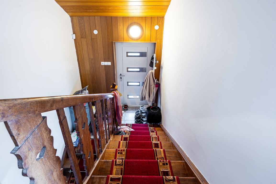 Nadstropje vključuje kuhinjo z jedilnico, dnevno sobo ter dve spalnici in otroško sobo, dnevno sobo,katera ima izhod na balkon, ter renovirano kopalnico in WC, ter celotna hiša ima nove talne obloge.