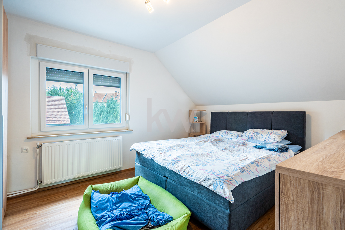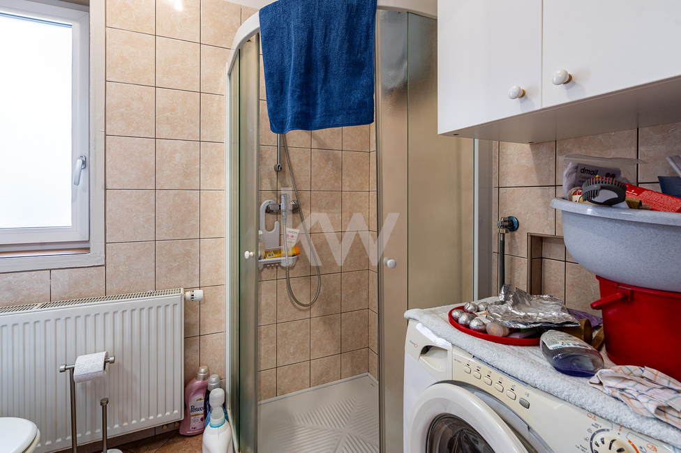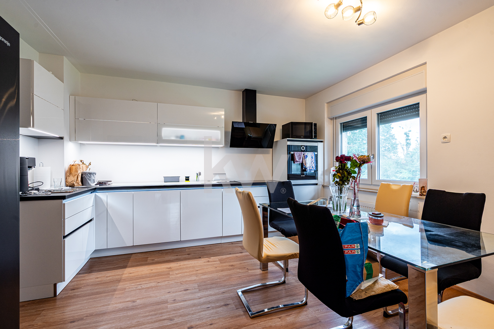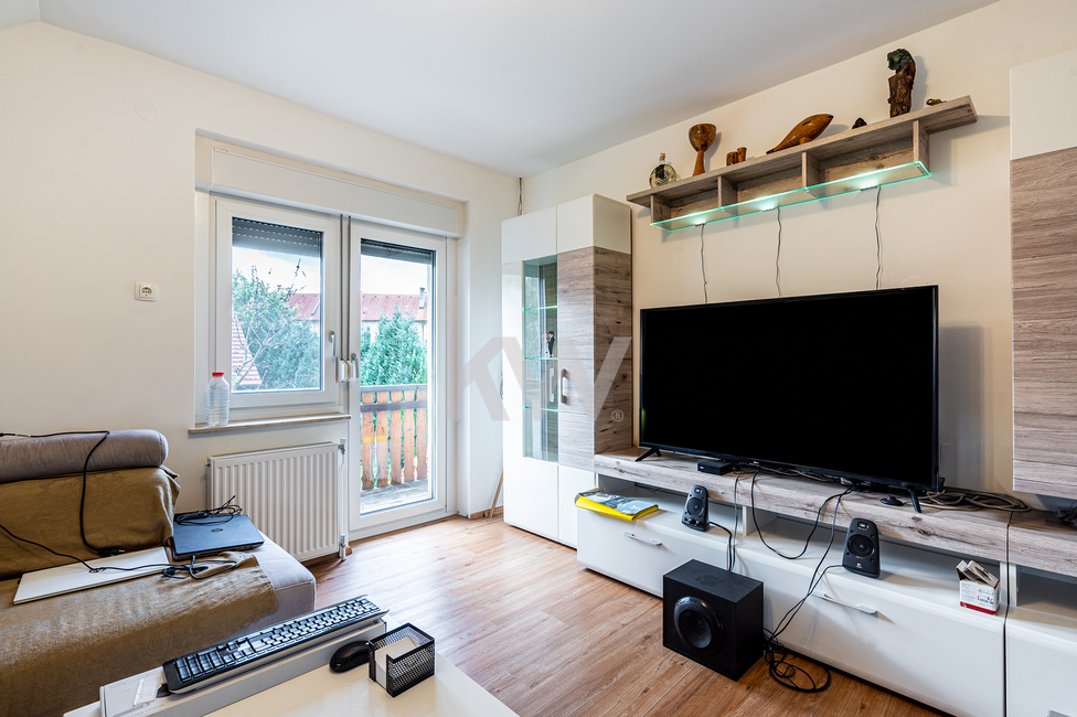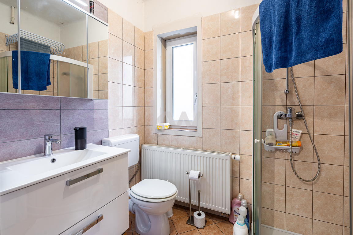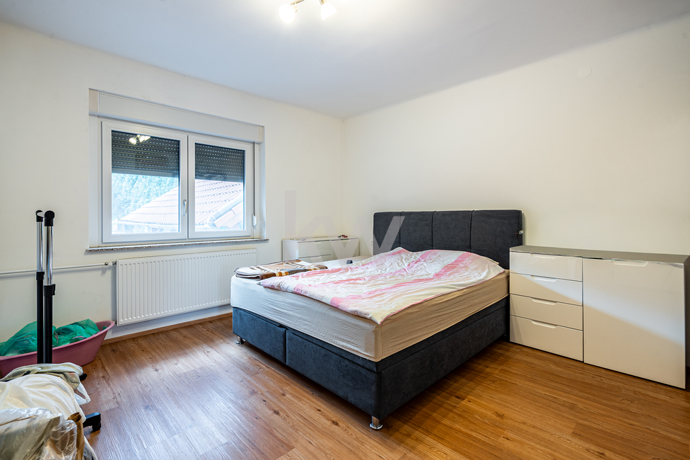 Nadstropje vključuje kuhinjo z jedilnico, dnevno sobo ter dve spalnici in otroško sobo, dnevno sobo,katera ima izhod na balkon, ter renovirano kopalnico in WC, ter celotna hiša ima nove talne obloge.