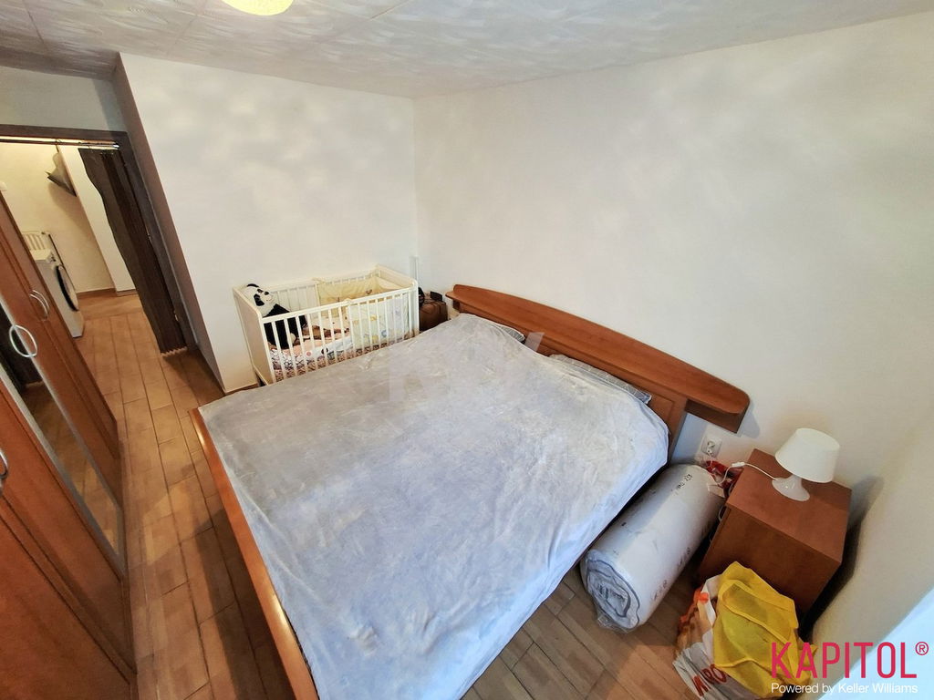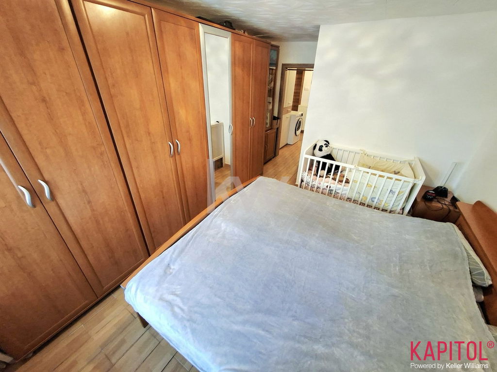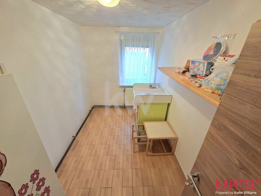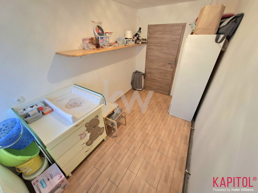 Razpored prostorov zajema kuhinjsko nišo, jedilnico z dnevnim prostorom, spalnico, otroško sobo, kopalnico in hodnikom. Pripada mu tudi prostorna klet z oknom.