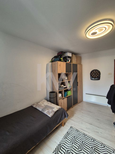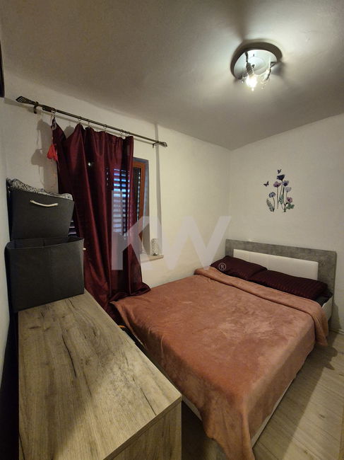 Razporeditev prostorov: hodnik, kopalnica, kuhinja z jedilnico, dnevna soba ter 2 spalnici.