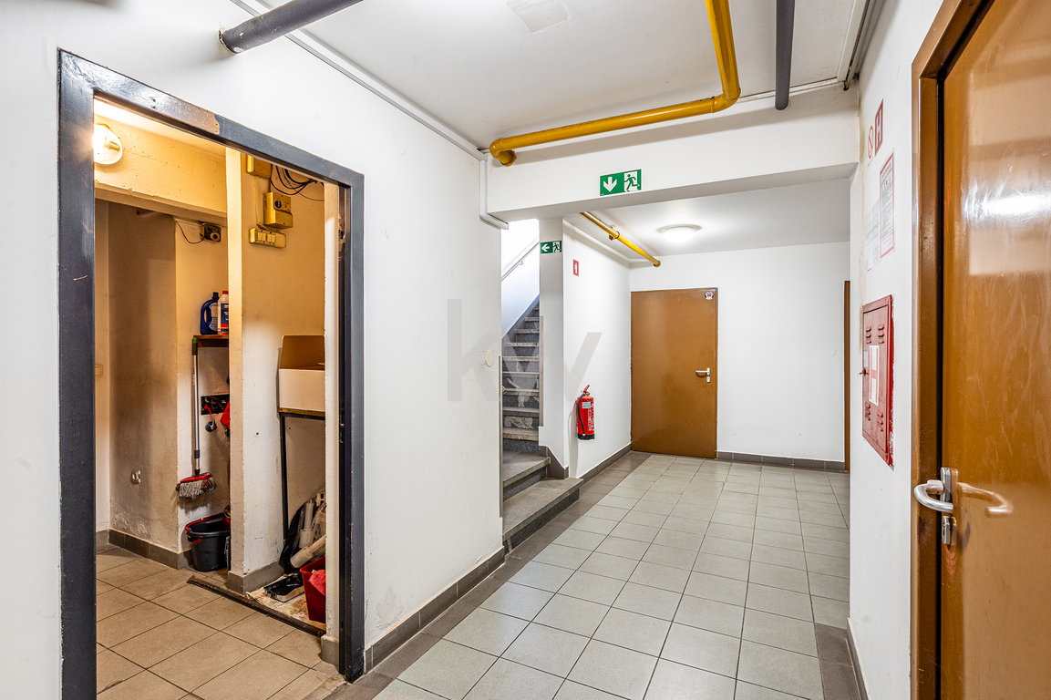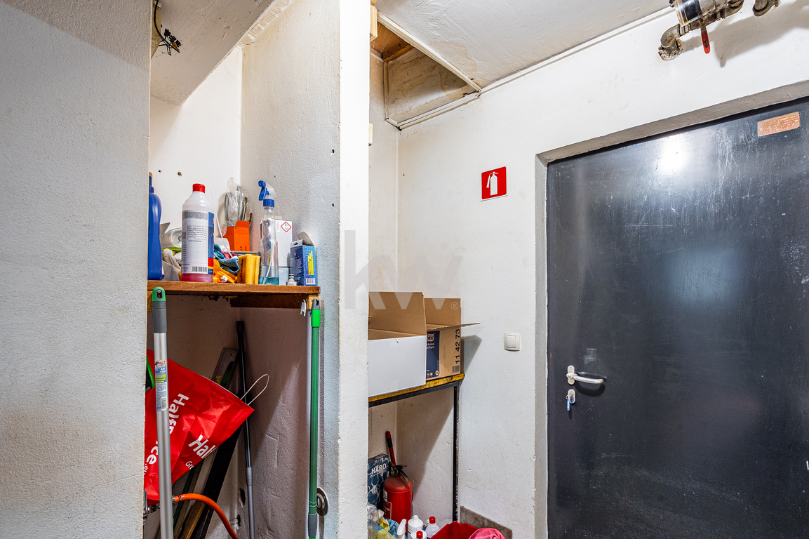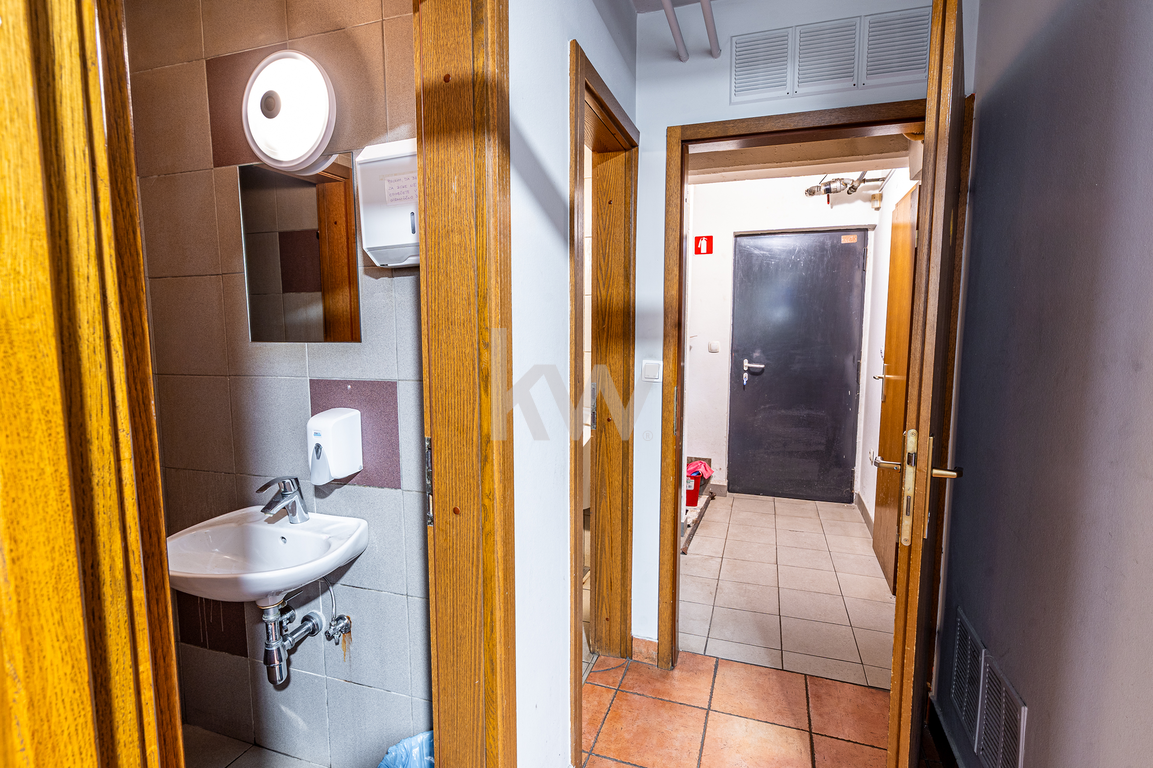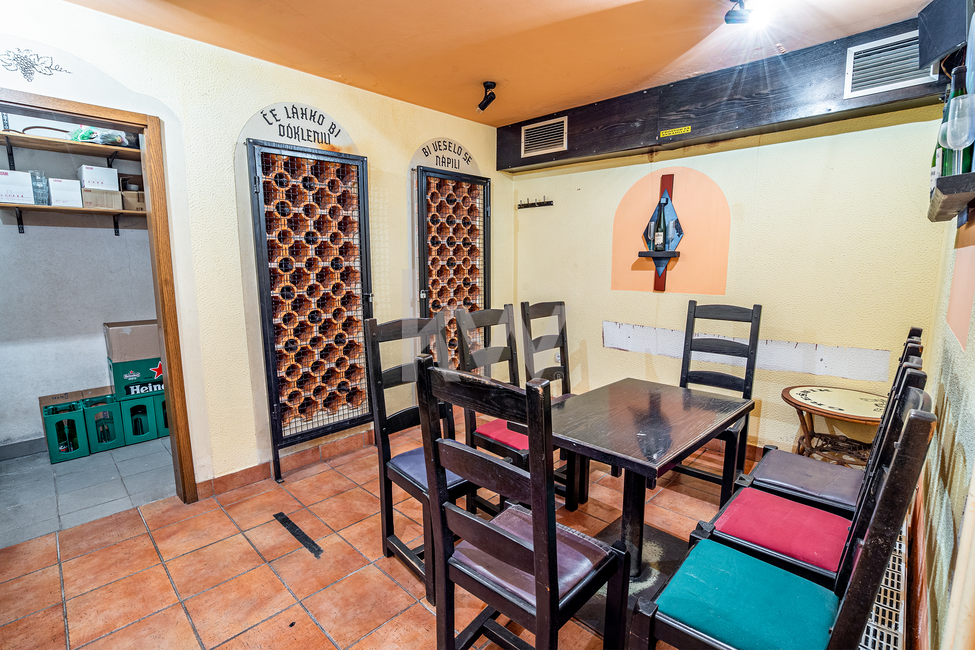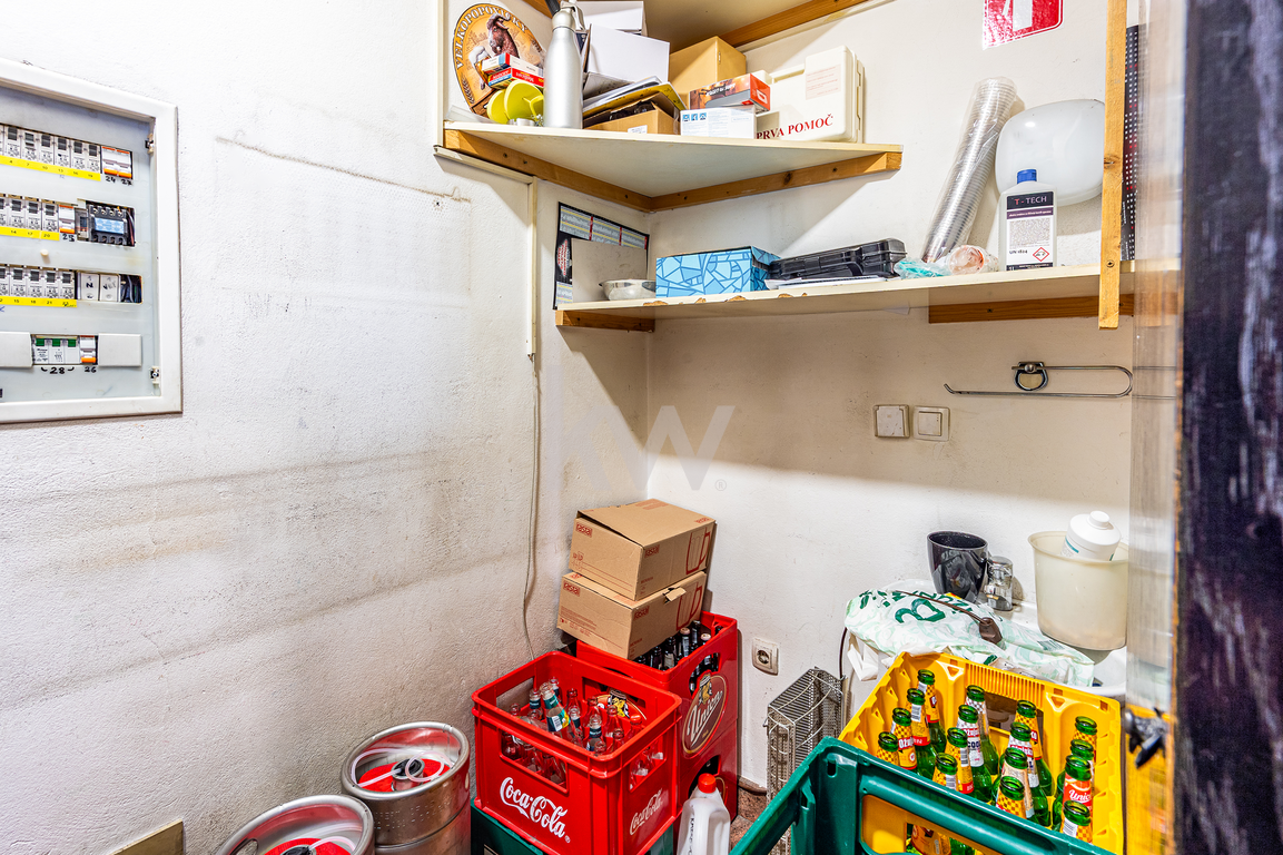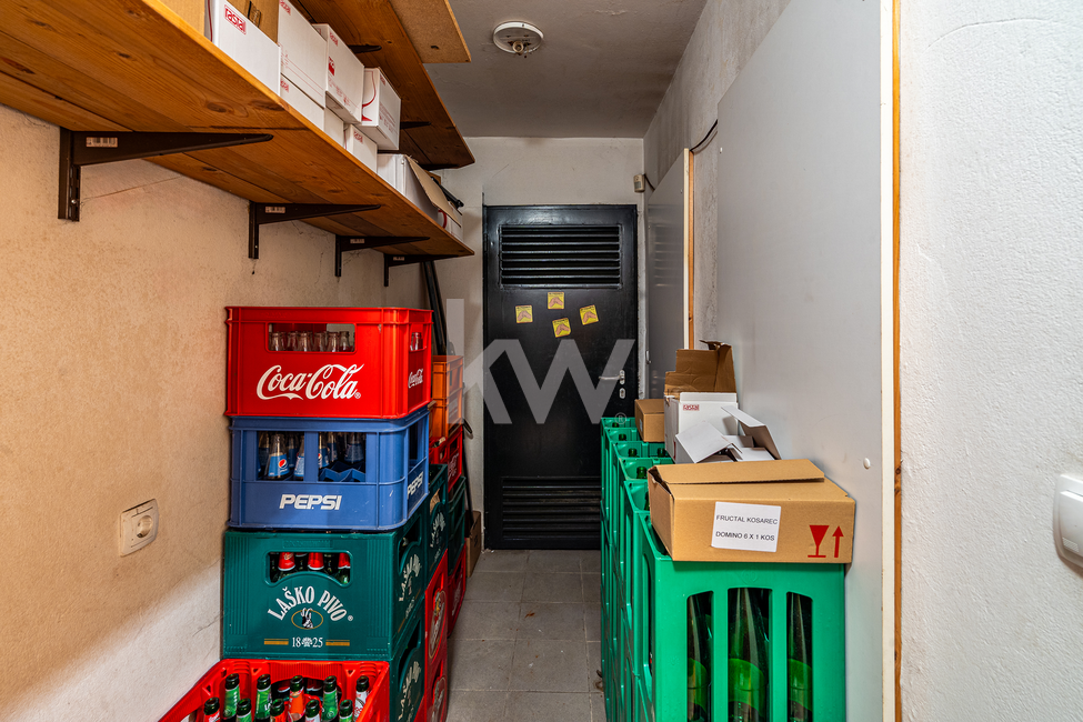 Kletni del dopolnjujejo shranjevalni prostori, dve sobi, tri sanitarije (ločene za osebje in stranke) ter izhod v notranji hodnik objekta. To omogoča funkcionalno ureditev – od delovnega dela, skladišča do prostorov za stranke.