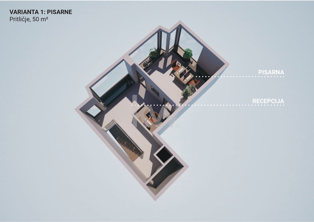 Pritličje zajema večji odprt prostor z visokimi stropi, shrambni del ter notranje stopnišče, ki vodi v spodnji nivo. Zaradi več vhodov je zelo enostavno vzpostaviti ločen dostop za stranke, osebje ali različne poslovne sklope.