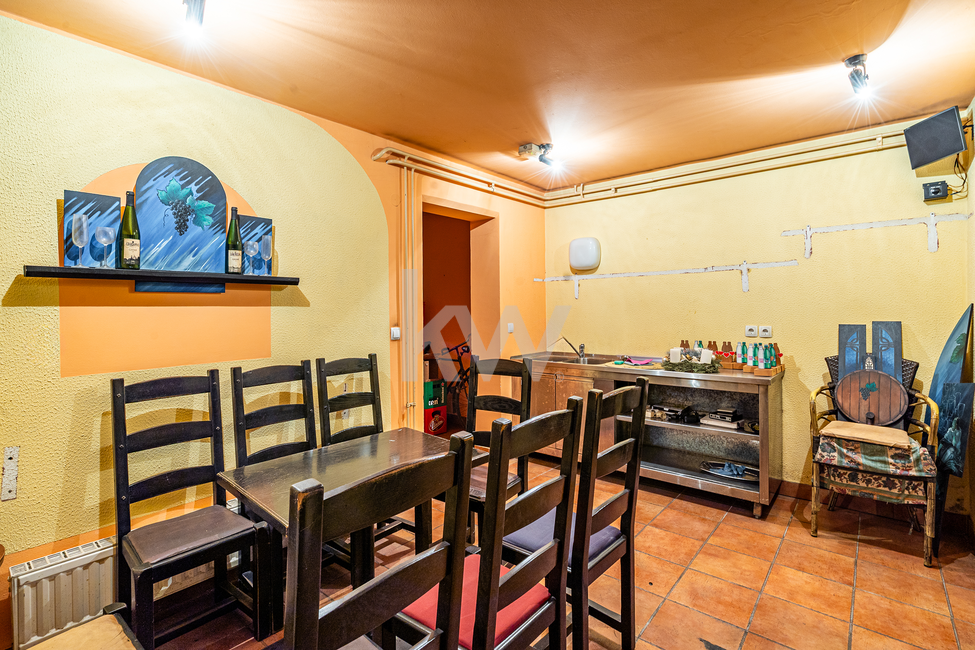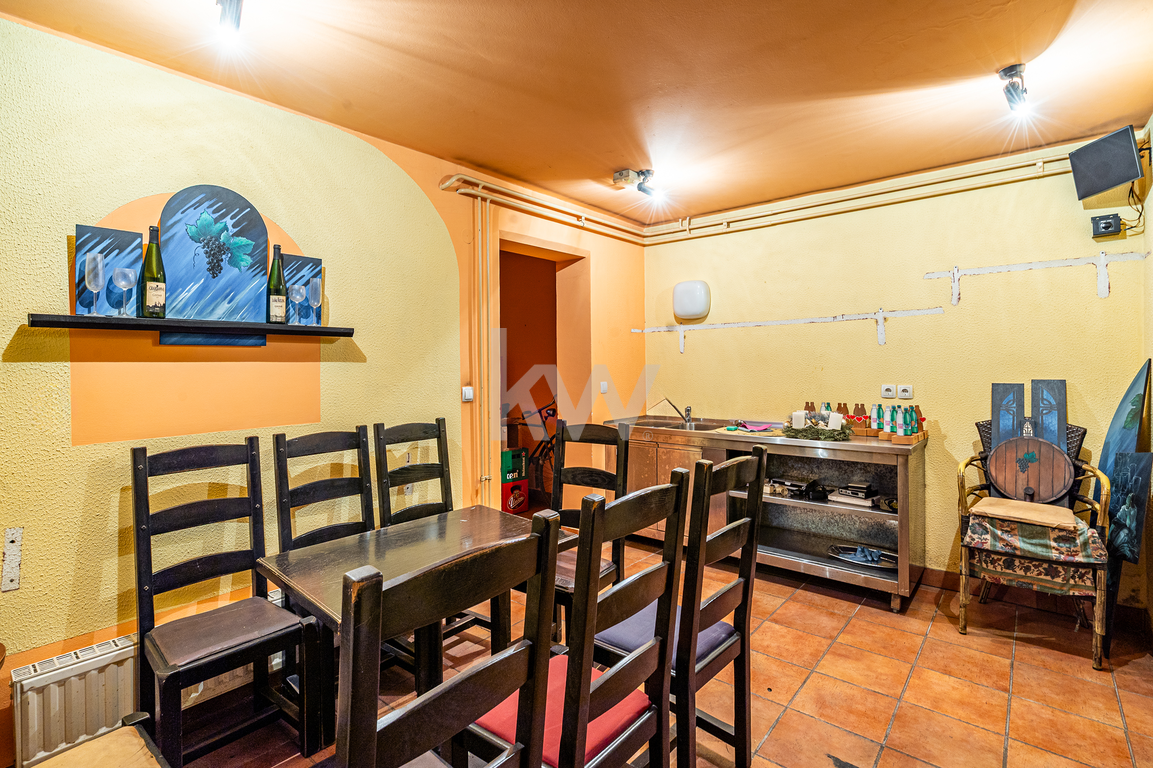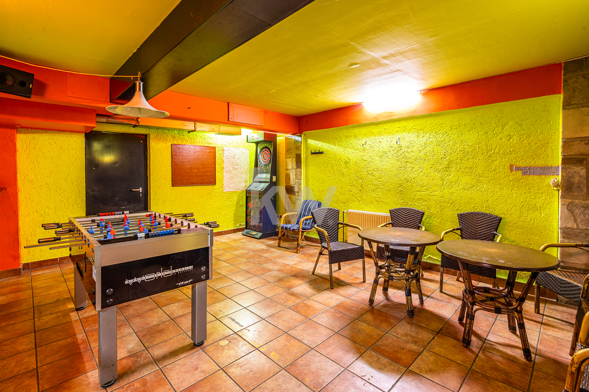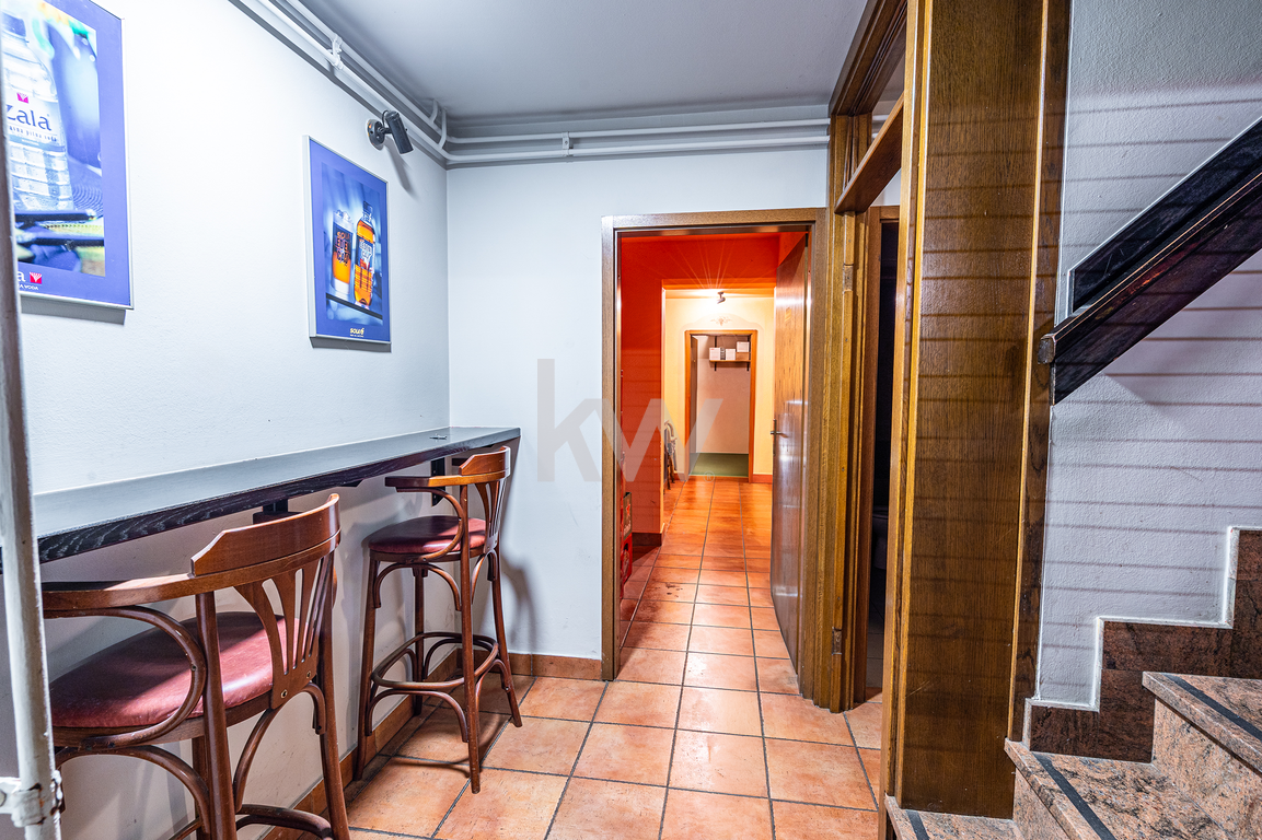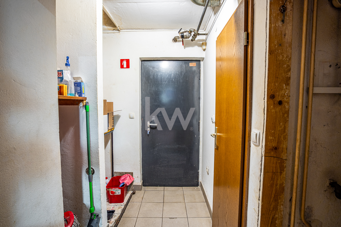 Kletni del dopolnjujejo shranjevalni prostori, dve sobi, tri sanitarije (ločene za osebje in stranke) ter izhod v notranji hodnik objekta. To omogoča funkcionalno ureditev – od delovnega dela, skladišča do prostorov za stranke.