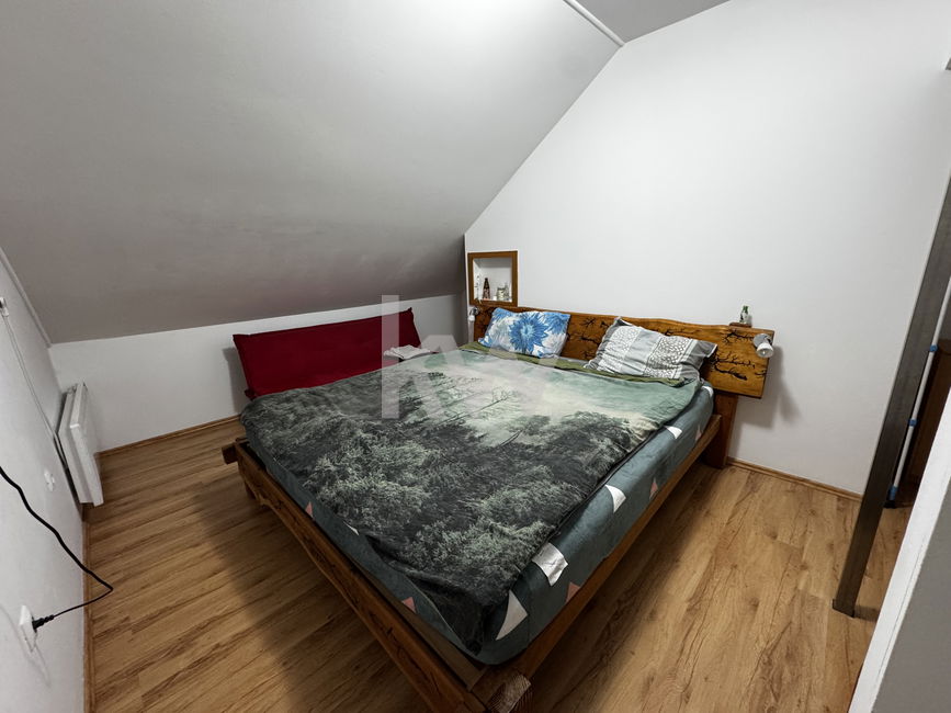 Po notranjem stopnišču se povzpnete v zgornjo mansardno spalnico, ki ponuja dodatno zasebnost ali ustvarjalni kotiček.