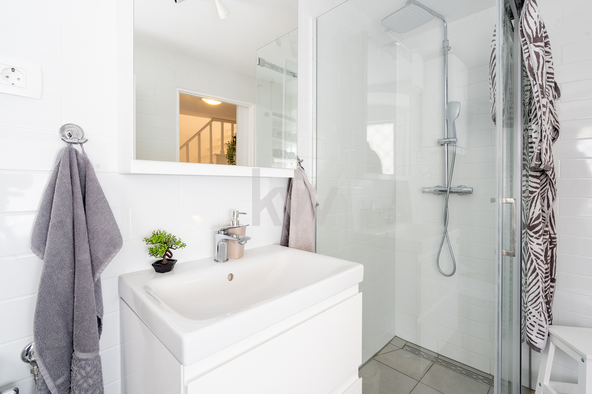 Ob vstopu v hišo, ne daleč stran od mestnega portona Muda, vas v pritličju hiše pričaka svetel foyer. Pritličje je primerno npr. za vaše goste, saj ima prav vse kar se potrebuje za prijetno in udobno bivanje - poleg foyera spalnico z oknom, kopalnico s talnim električnim gretjem in manjšim oknom ter manjšo kuhinjico s talnim gretjem. Za dobro prezračevanje pritličnih prostorov je poskrbljeno s prezračevalnim sistemom.