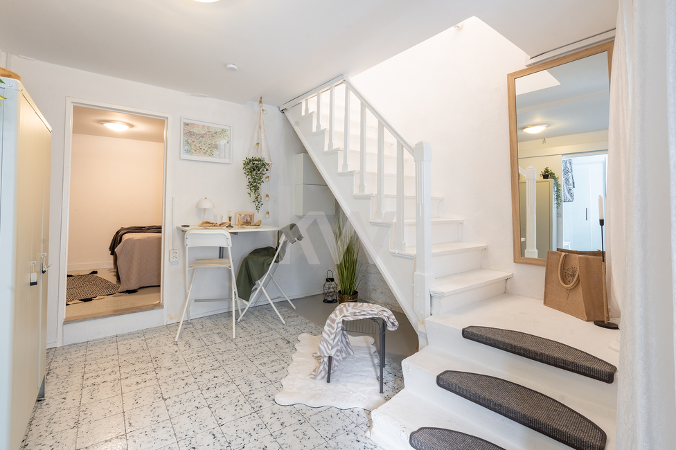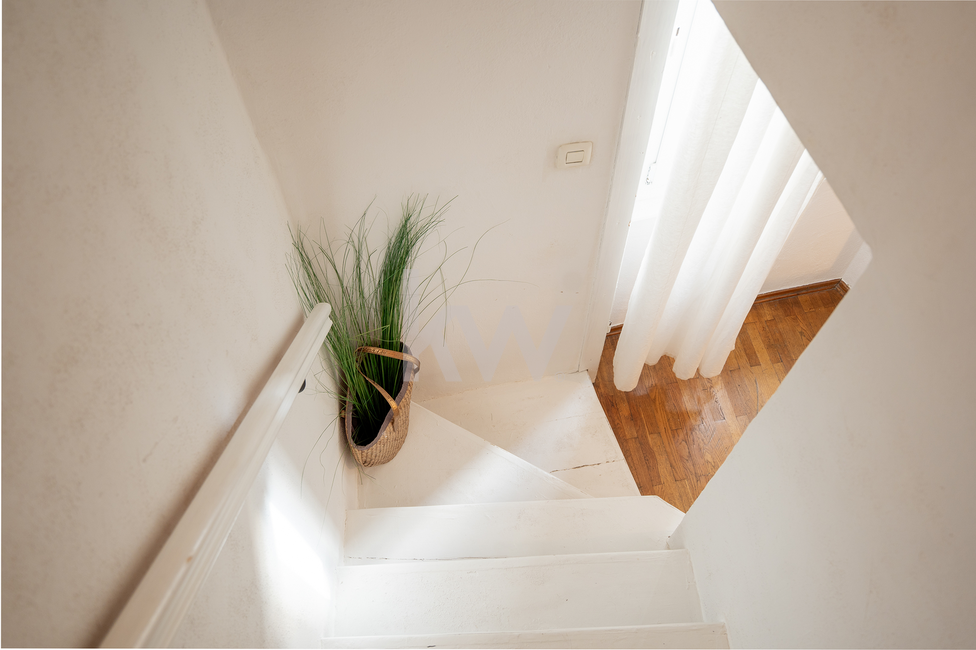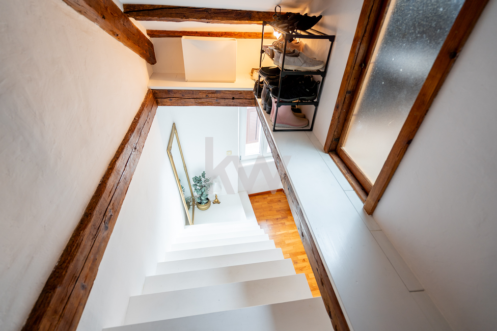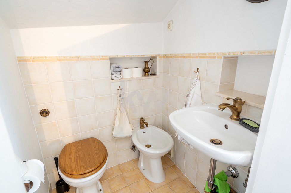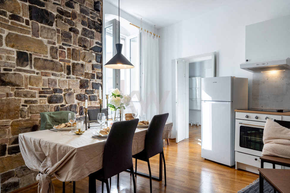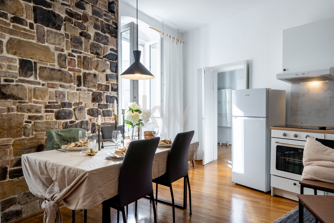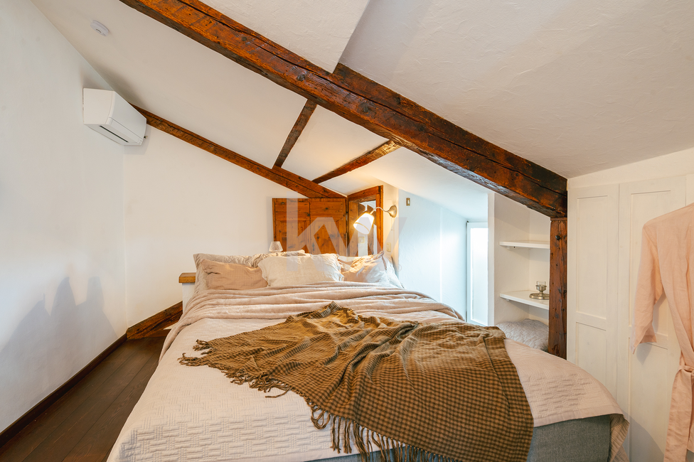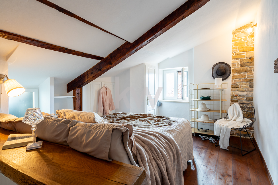 Mansarda (Master spalnica): V vrhnjem delu se nahaja glavna spalnica z lastnim toaletnim prostorom. Poseben pečat prostoru dajejo ohranjeni in restavrirani leseni elementi starega ostrešja, ki poudarjajo zgodovinski karakter stavbe.