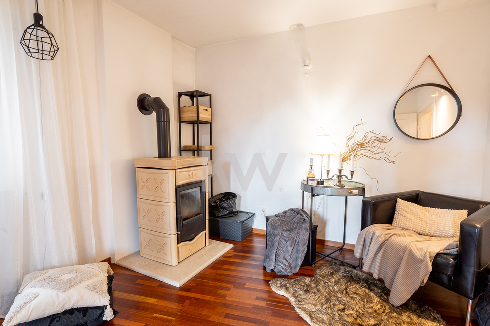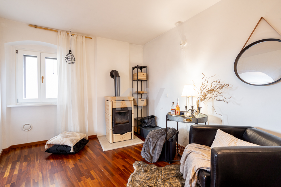 2. nadstropje (Dnevni prostor): Celotna etaža je namenjena veliki in svetli dnevni sobi. Prostor plemeniti delno pregrajen kotiček s kakovostno švedsko pečjo, ki v hladnejših dneh zagotavlja toplino in ustvarja romantično atmosfero.