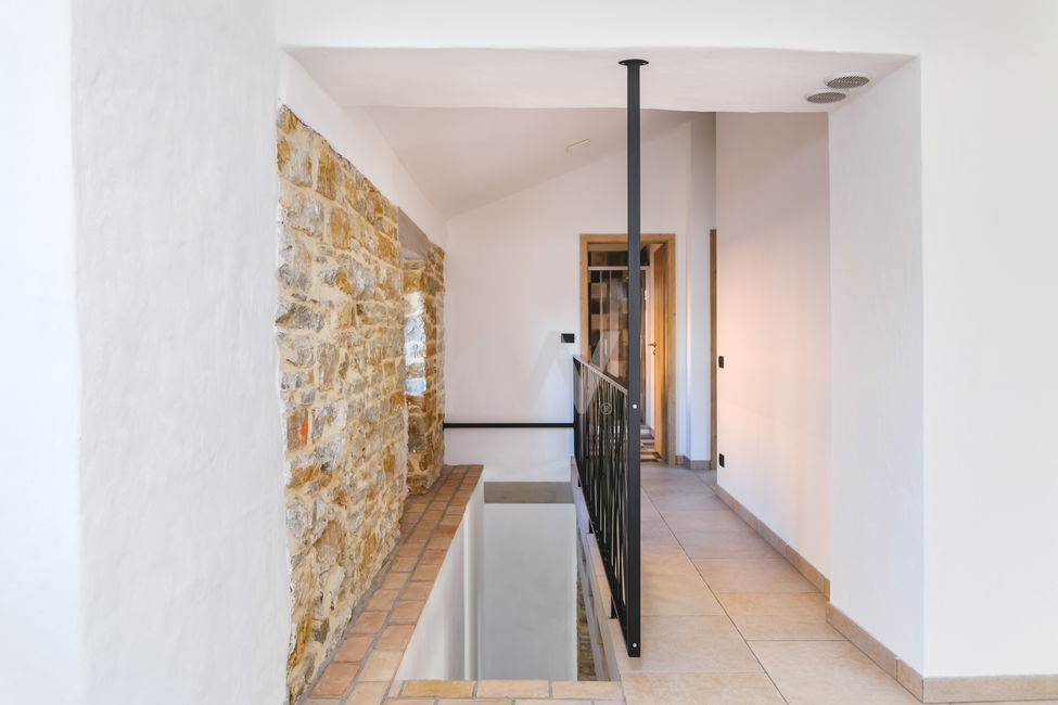 Stanovanje v nadstopju: večji hodnik, ki vodi do dnevnega prostora s kuhinjo in jedilnico z lepim pogledom na Koper in Trst, kopalnica in dve spalnici