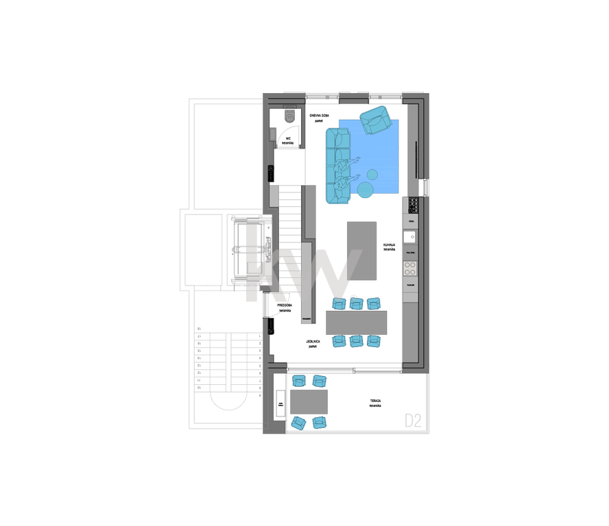 Skupaj: 107,3 m² neto bivalnih površin, dopolnjenih z zunanjimi in pomožnimi prostori za popolno udobje, kar znese skupaj z vsemi lastniškimi prostori 233,3 m².