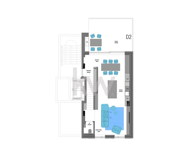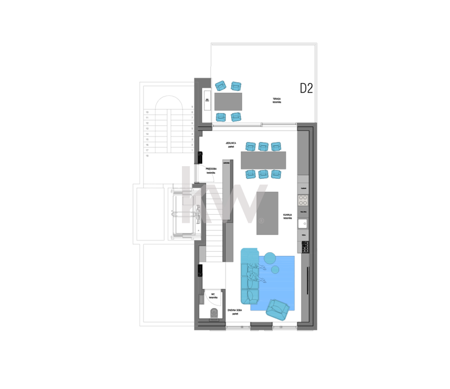 Bivalni del se odpira na teraso in na lastniški atrij:
