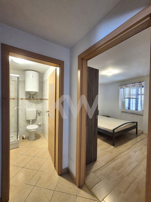 Razporeditev prostorov: predprostor, kopalnica, kuhinja z jedilnico, dve sobi.