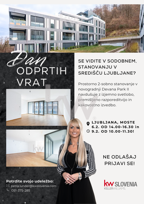 V središču Ljubljane, v sodobni in arhitekturno prepoznavni novogradnji Devana Park II (2024), prodamo prostorno in izjemno svetlo 2-sobno stanovanje v skupni izmeri 79 m².