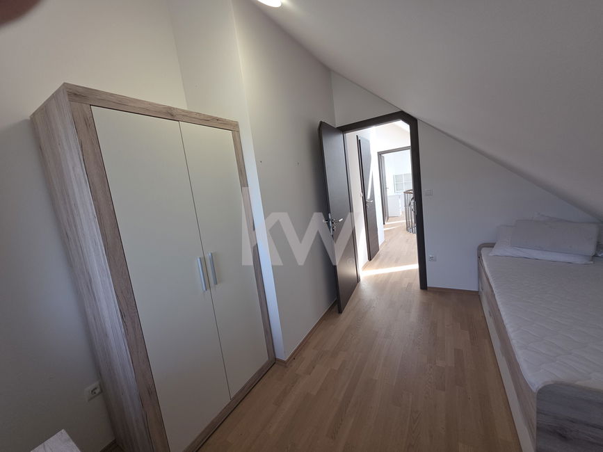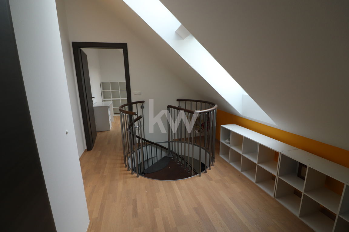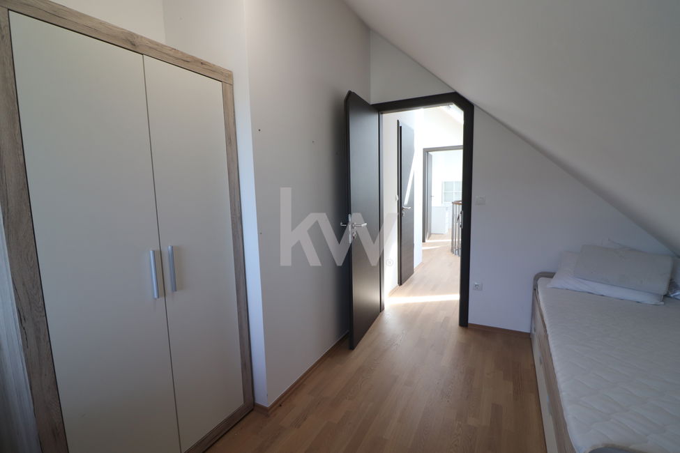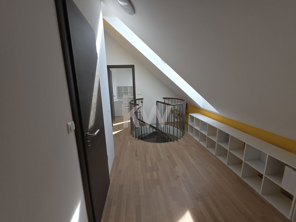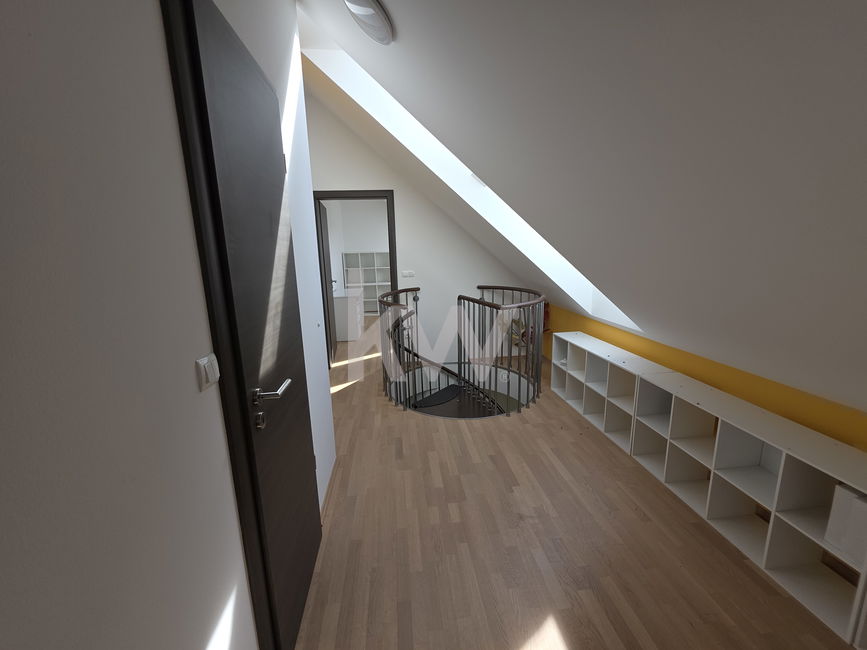 Mansarda: Galerija. Kopalnica s tušem in WC. Spalnica. Otroška soba. Shramba v pritličju