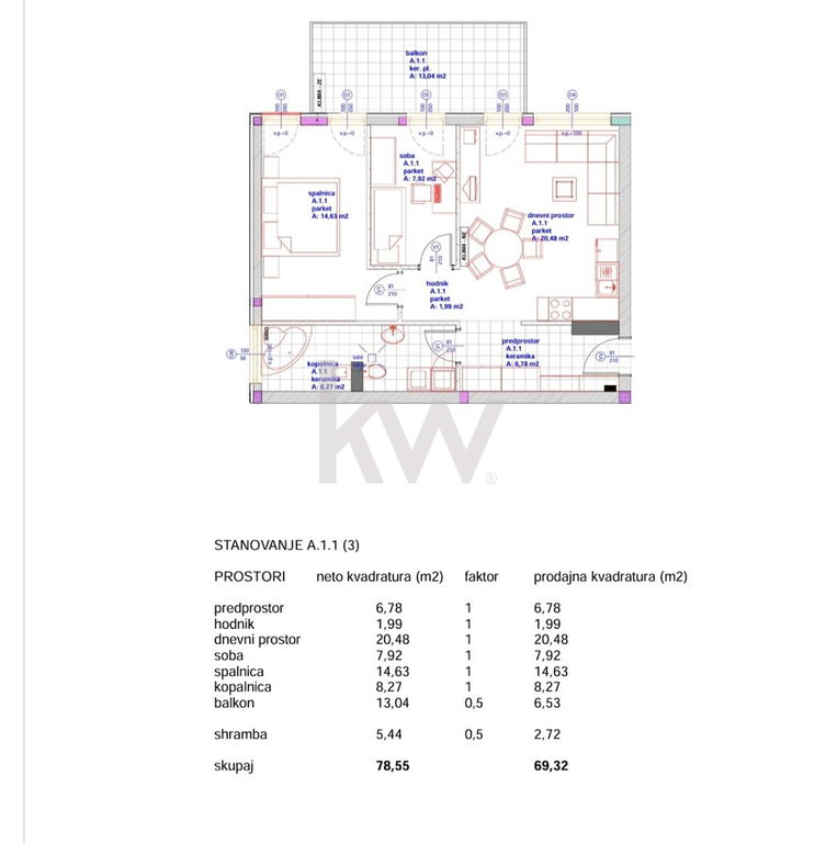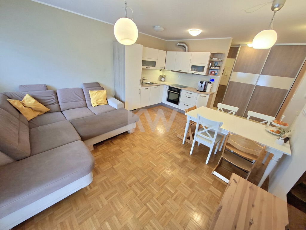 Odličen razpored prostorov po podatkih GURS obsega 78,60m2 neto tlorisne površine, od tega predstavlja bivalni prostor 60,10m2, klet 5,40m2 in terasa 13,10m2: