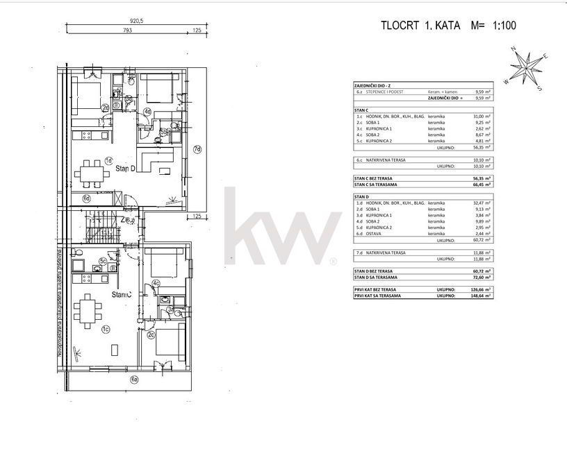 Stanovanje se nahaja v pritličju stanovanjske stavbe in obsega hodnik, shrambo, kopalnico ter kuhinjo z jedilnico in dnevno sobo v "open space" konceptu. Iz jedilnice je izhod na veliko teraso. Stanovanje ima dve spalnici, od katerih ima ena lastno kopalnico.