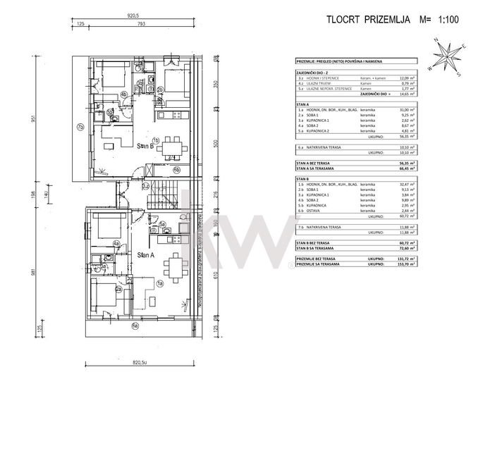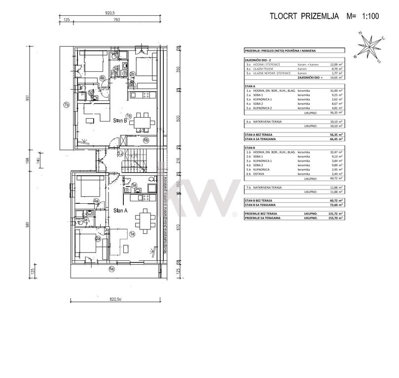 Stanovanje se nahaja v 1.nadstropju stanovanjske stavbe in obsega hodnik, shrambo, kopalnico ter kuhinjo z jedilnico in dnevno sobo v "open space" konceptu. Iz jedilnice je izhod na veliko teraso. Stanovanje ima dve spalnici, od katerih ima ena lastno kopalnico.