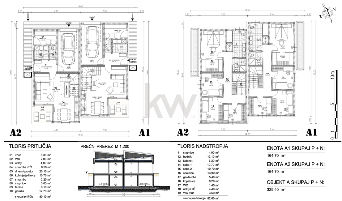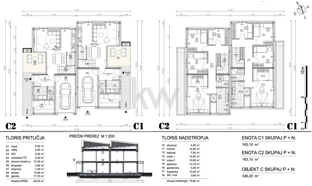 - Pritličje: garaža, shramba s tč, predprostor, utility, wc, shramba, dnevni prostor s kuhinjo in jedilnico.