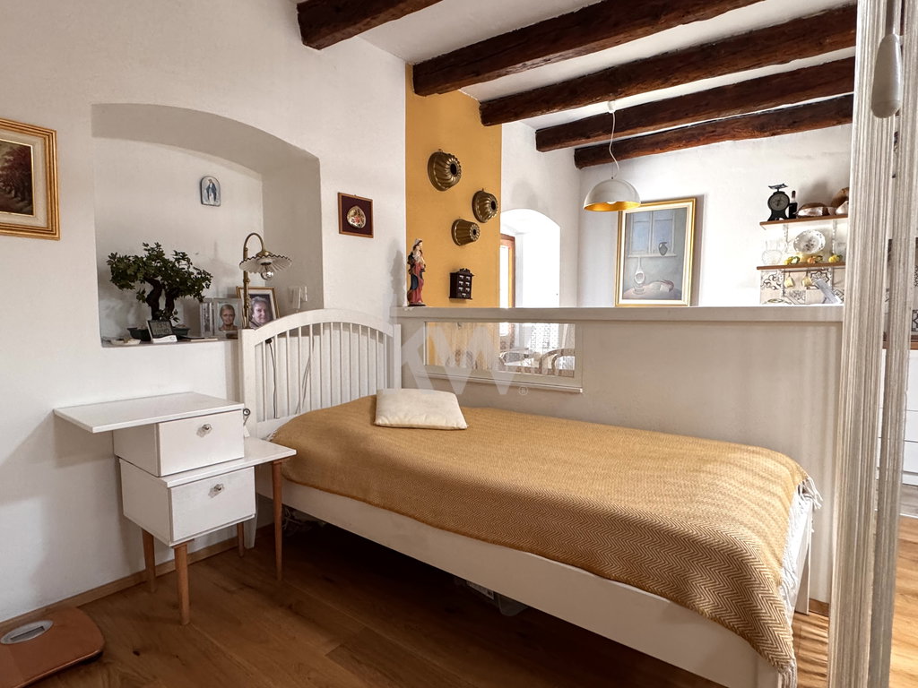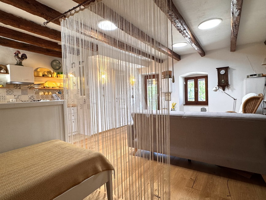 Zgornja etaža je urejena kot svetel, odprt bivalni prostor. Dostop poteka po zunanjih stopnicah in balkonu. Prostor deluje zračno in povezano - kuhinja z jedilnico prehaja v dnevni del, spalni kotiček je diskretno ločen, vse skupaj pa dopolnjuje ločena kopalnica. Ob prenovi so bila zamenjana tla s hrastovim parketom, urejene vse inštalacije ter izolacija okoli stavbe in strehe. Ogrevanje je na pelete, okna in vrata so lesena, troslojna.