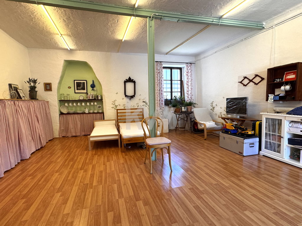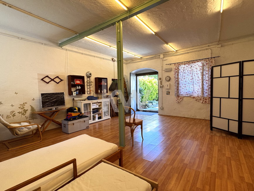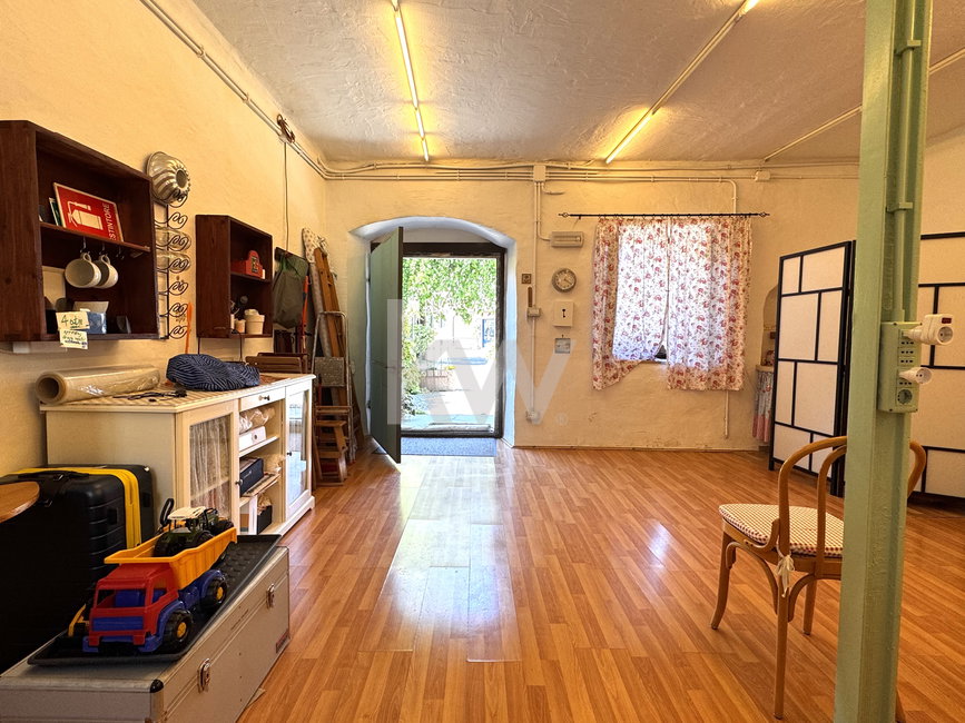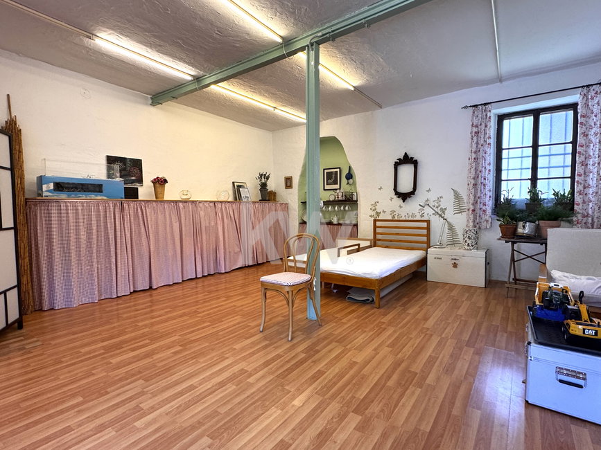 Pritličje ponuja povsem drugačen potencial. Trenutno je zasnovano kot enoten odprt prostor z že urejenimi priključki (elektrika, voda, odtoki) in kopalnico. Lahko ga preoblikujete v dodatno stanovanje, delovni prostor ali ga namenite poslovni dejavnosti - od studia do delavnice.