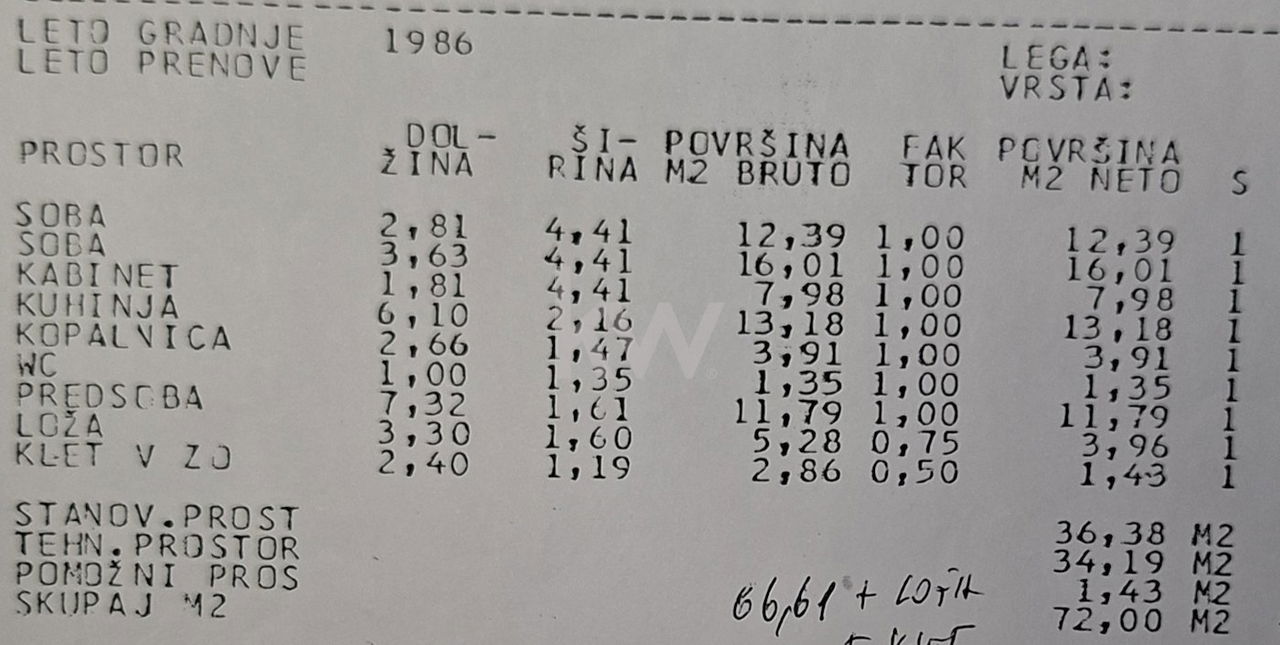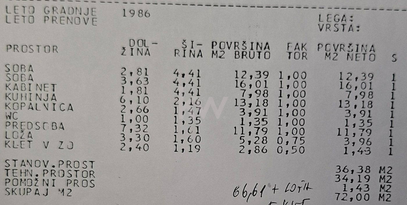 Stanovanje meri 74,75 m² skupne površine, od tega 66 m² bivalnega prostora, 5,28 m² balkona ter 2,86 m² kleti, po podatkih GURS pa meri 72 m² z upoštevanimi korekcijskimi faktorji balkona in kleti.